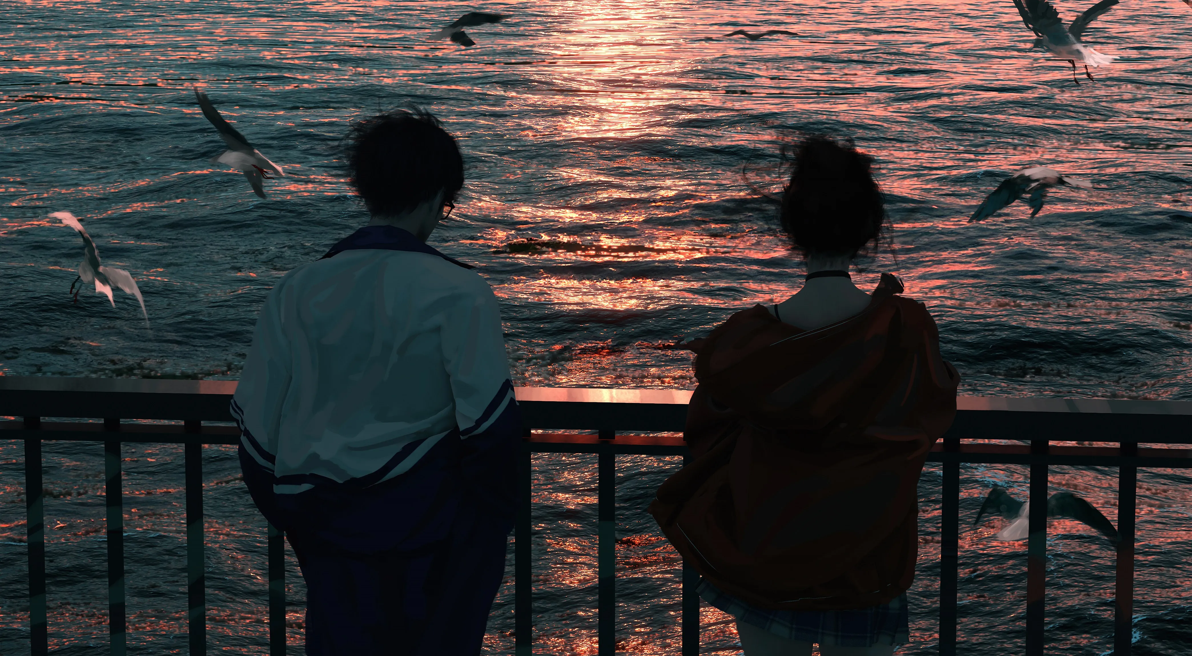 زوجين امرأة شعر أسود طويل فن رقمي قطعة فنية رسم رسم بحر طيور حيوانات طائر البحر رجل غروب الشمس ضوء الشمس أحمر سترة 4K Wallpapers