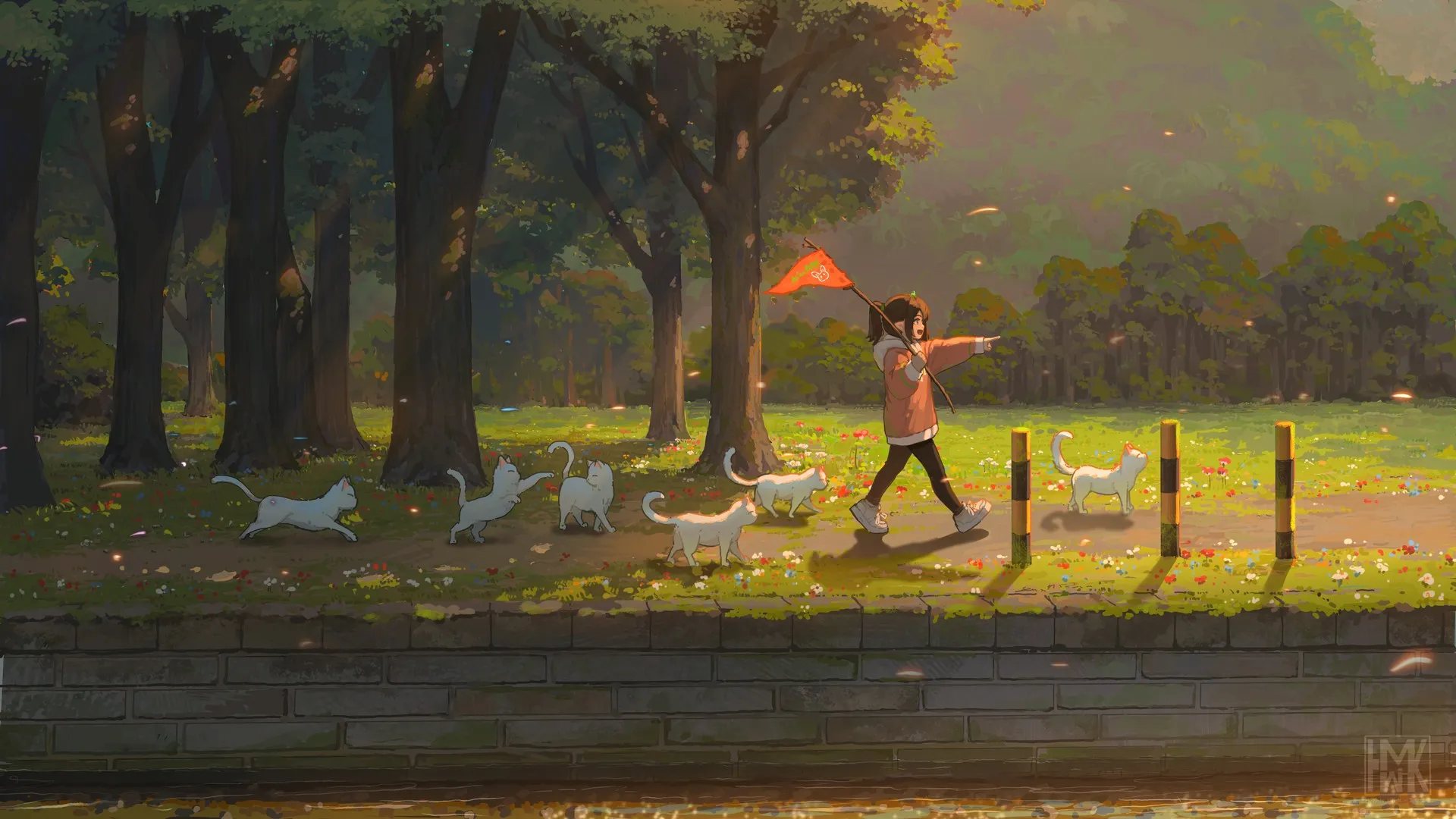 Illustration Anime girl Cat Nature Forest Animal ears Flag Animal Trees Computer wallpaper 4K wallpaper