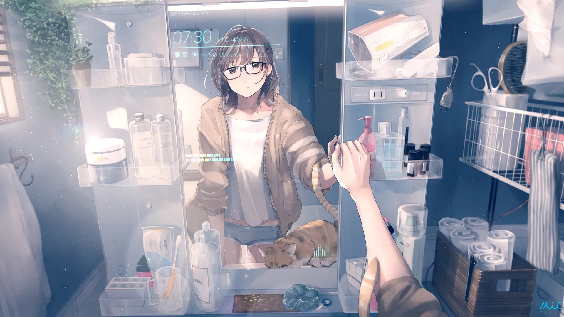 Standing, Maeda Microphone, Animation, Animation Girl, Mirror, Reflection, Cat, Indoor, Computer Wallpaper, 4K Wallpaper