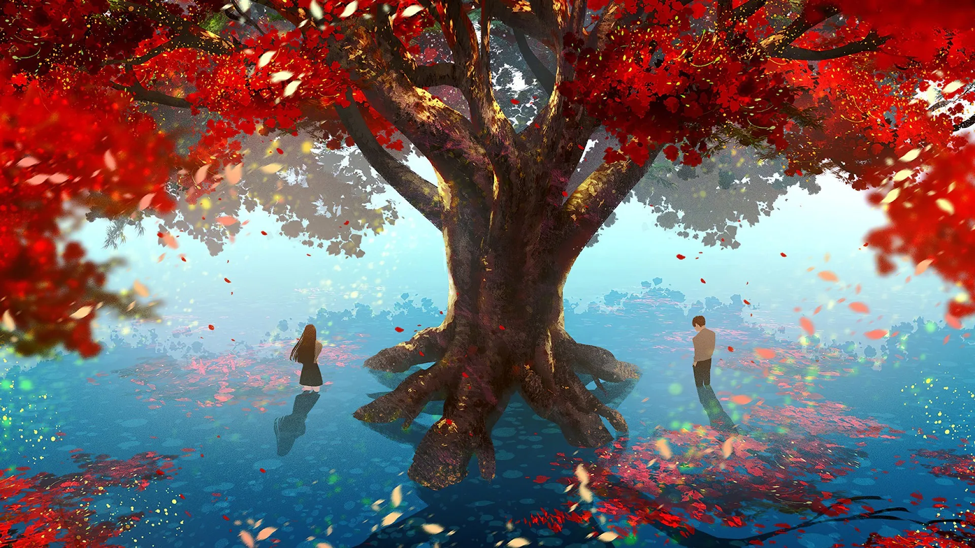 أنتيم، مناظر طبيعية، أشجار، ألوان متعددة، فتى أنمي، فتاة أنمي