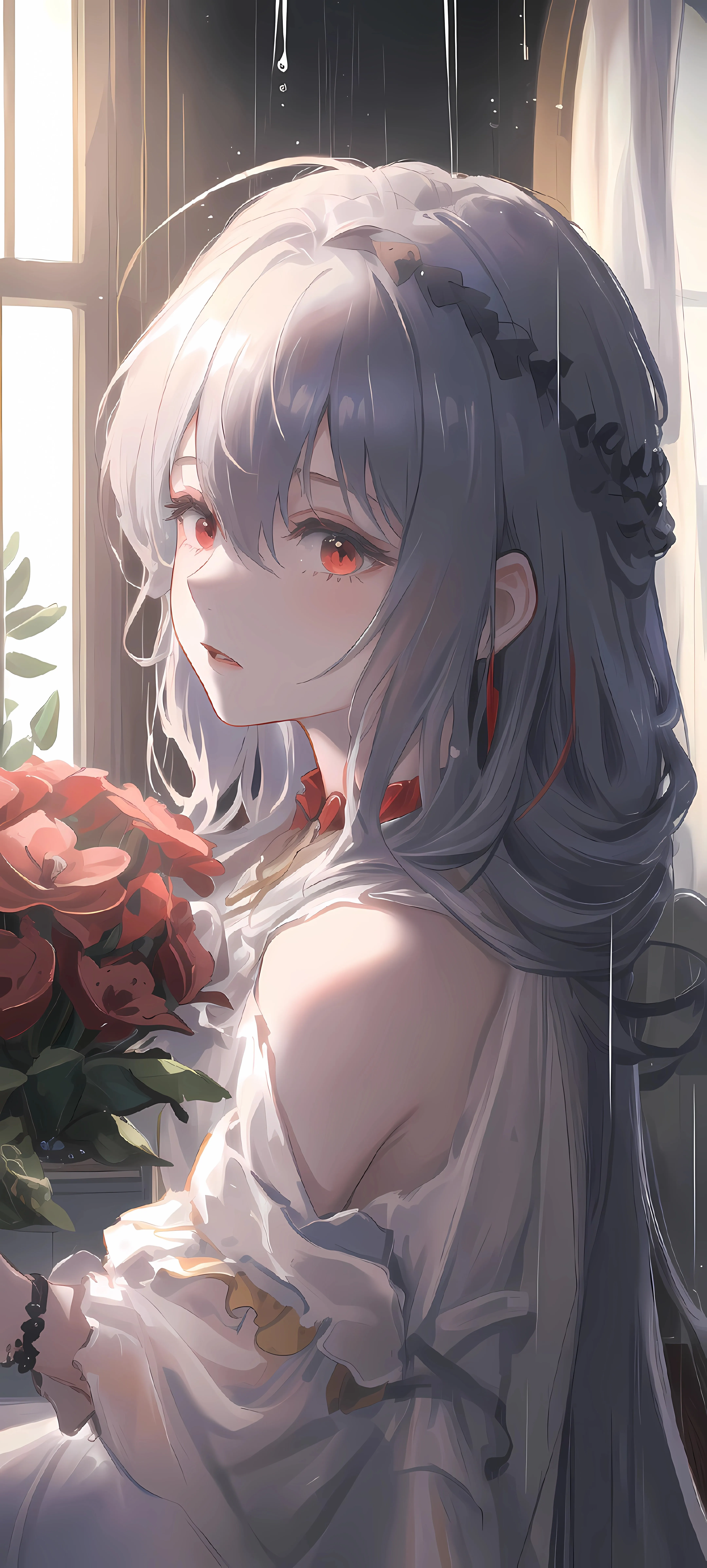 Red Eyes, Long Hair, Anime, Anime Girl, Flowers, Grey Hair, Art, Mobile Wallpaper, 4K Wallpaper
