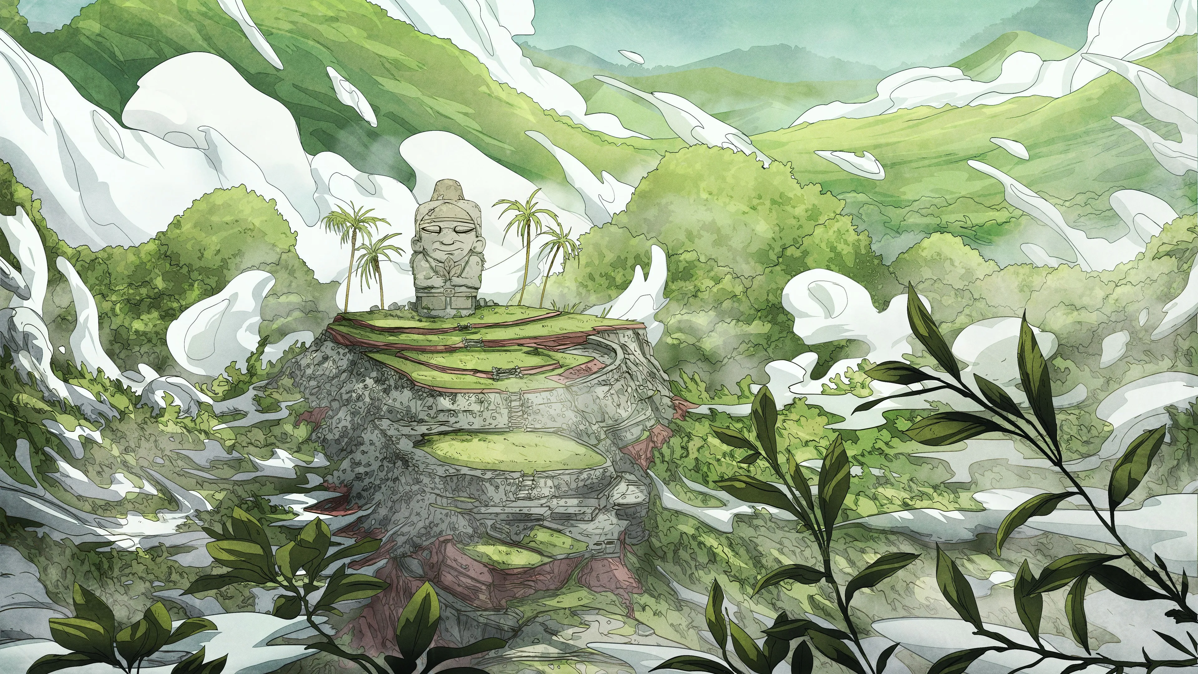 فنون الذكاء الاصطناعي، فن خيالي، تمثال، جبل، نبات، ورق جدران 4K