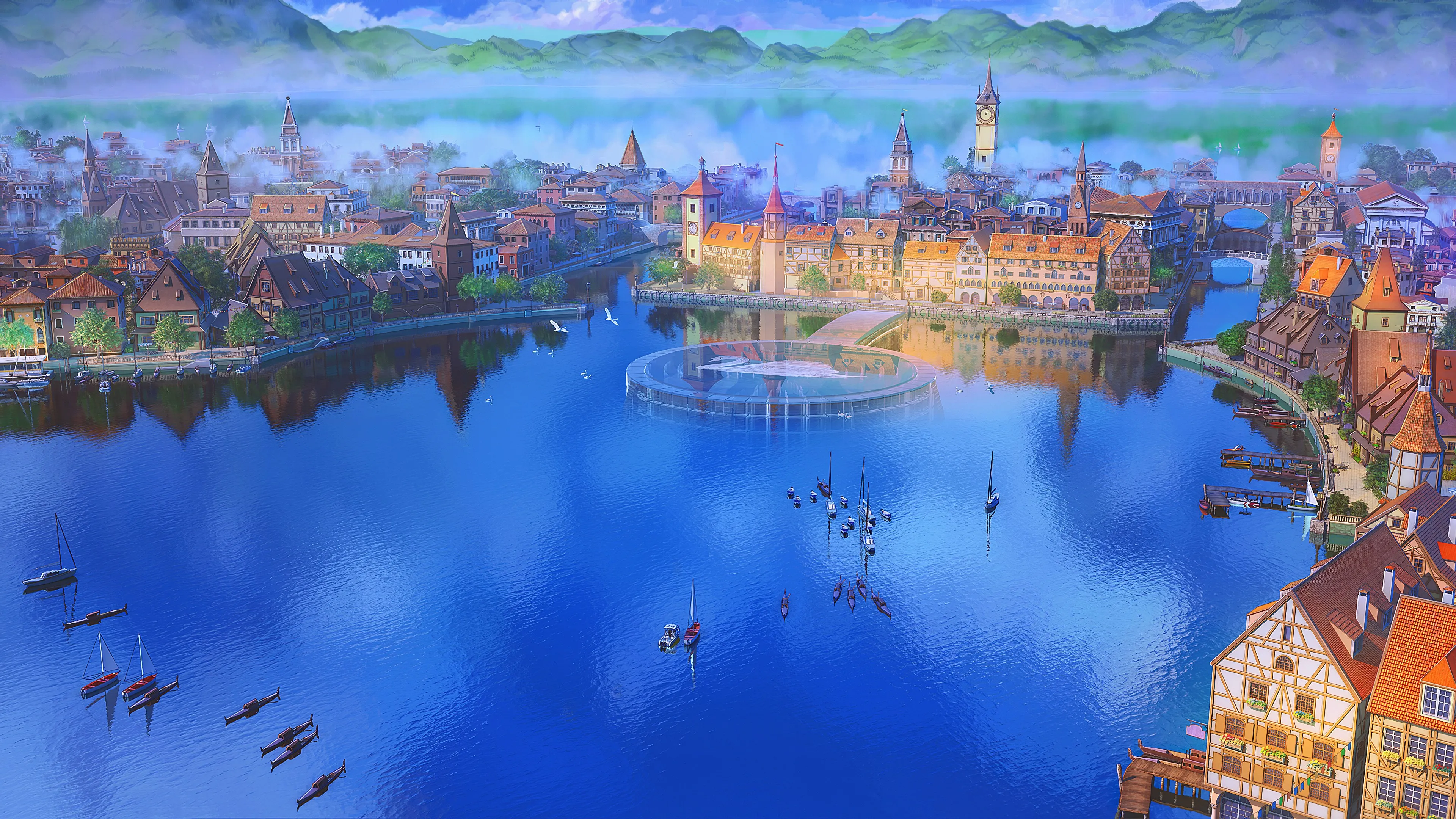 فن خيالي، فن آلي، بحيرة، مدينة، بلدة، ضوء الشمس، مناطق مائية، ميناء، سفينة، ورق جدران حاسوب، ورق جدران 4K
