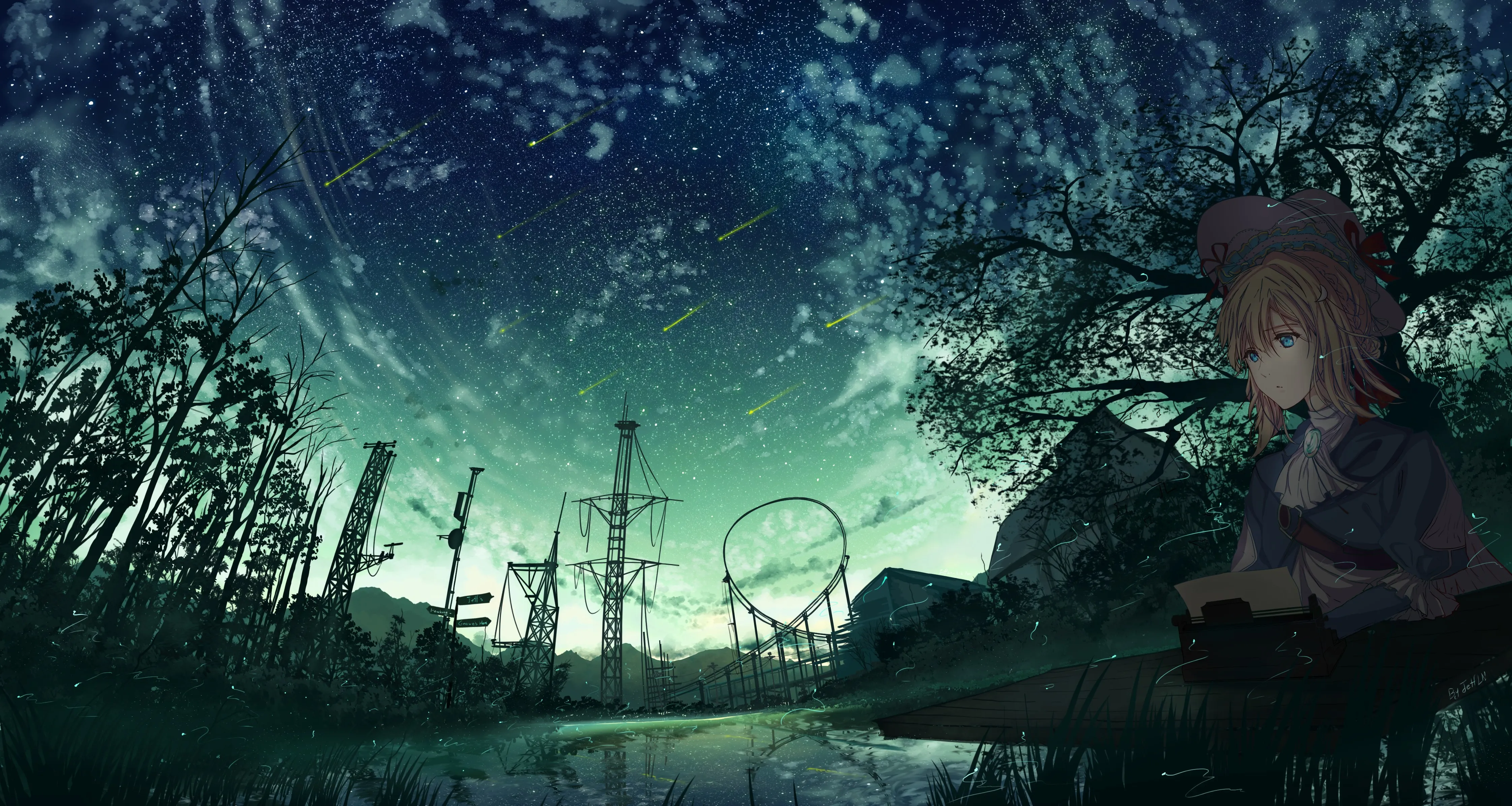 اللون الأرجواني، أنمي، مناظر طبيعية، ليل، أنمي، فتاة، السماء الليلية، ورق جدران حاسوب، ورق جدران 4K