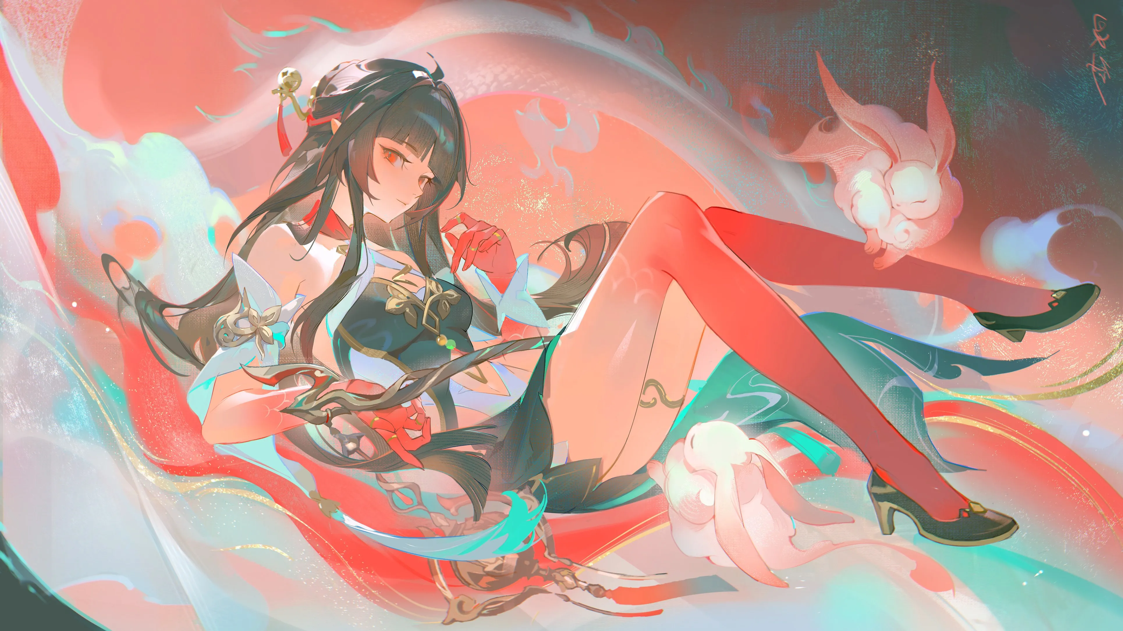 الجسم، شعر أسود، عيون حمراء، شعر أمامي، جزيرة، حديد النجم، لينغ شا، أنمي، فتاة، كعوب، خلفية بسيطة، أرنب، حيوان، زينة، خيوط، قميص صيني، خيال، ورق 4K