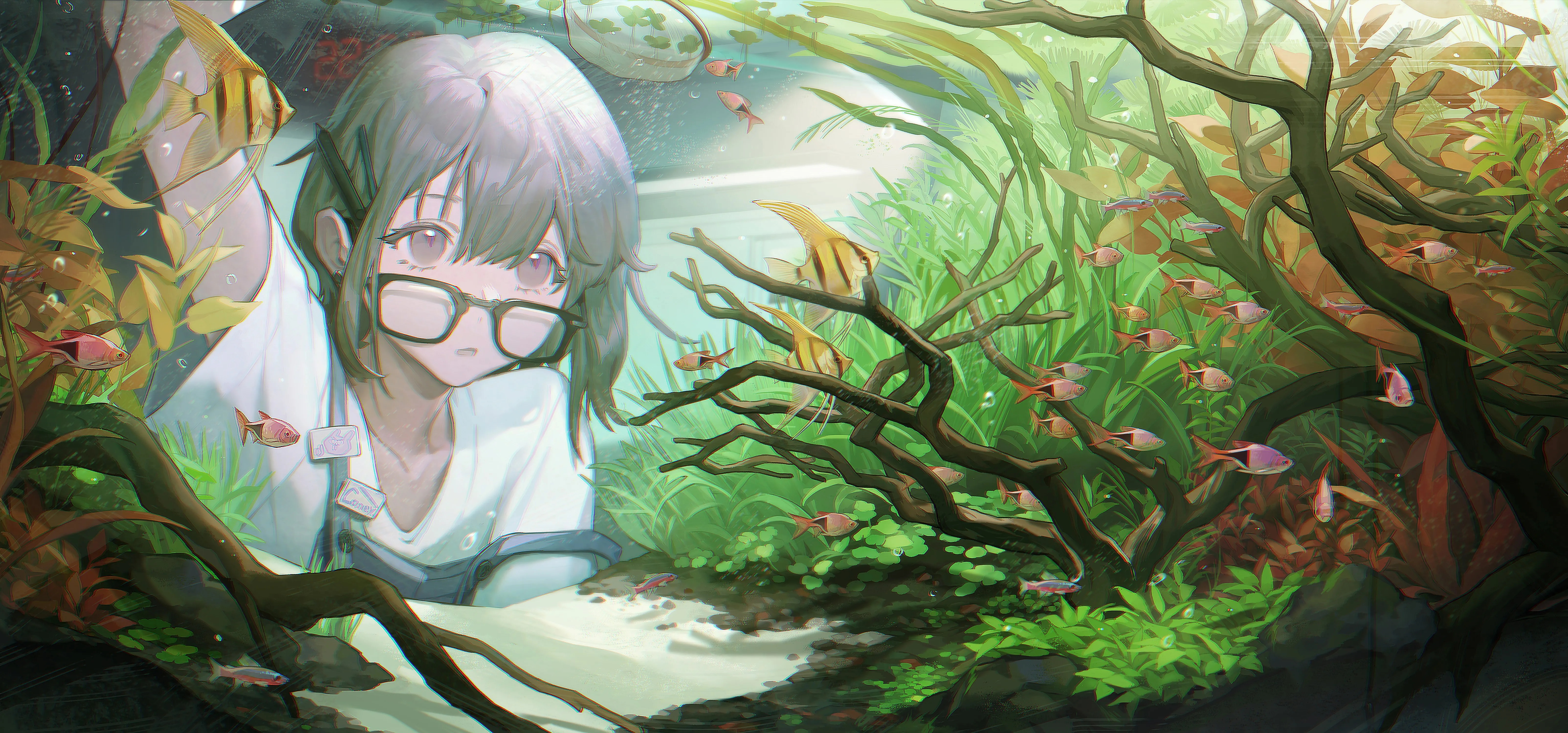 شعر داكن قصير عيون رمادية أنمي فتاة نظارات السمكة حوض السمك قلم ساعة ورق جدران 4K