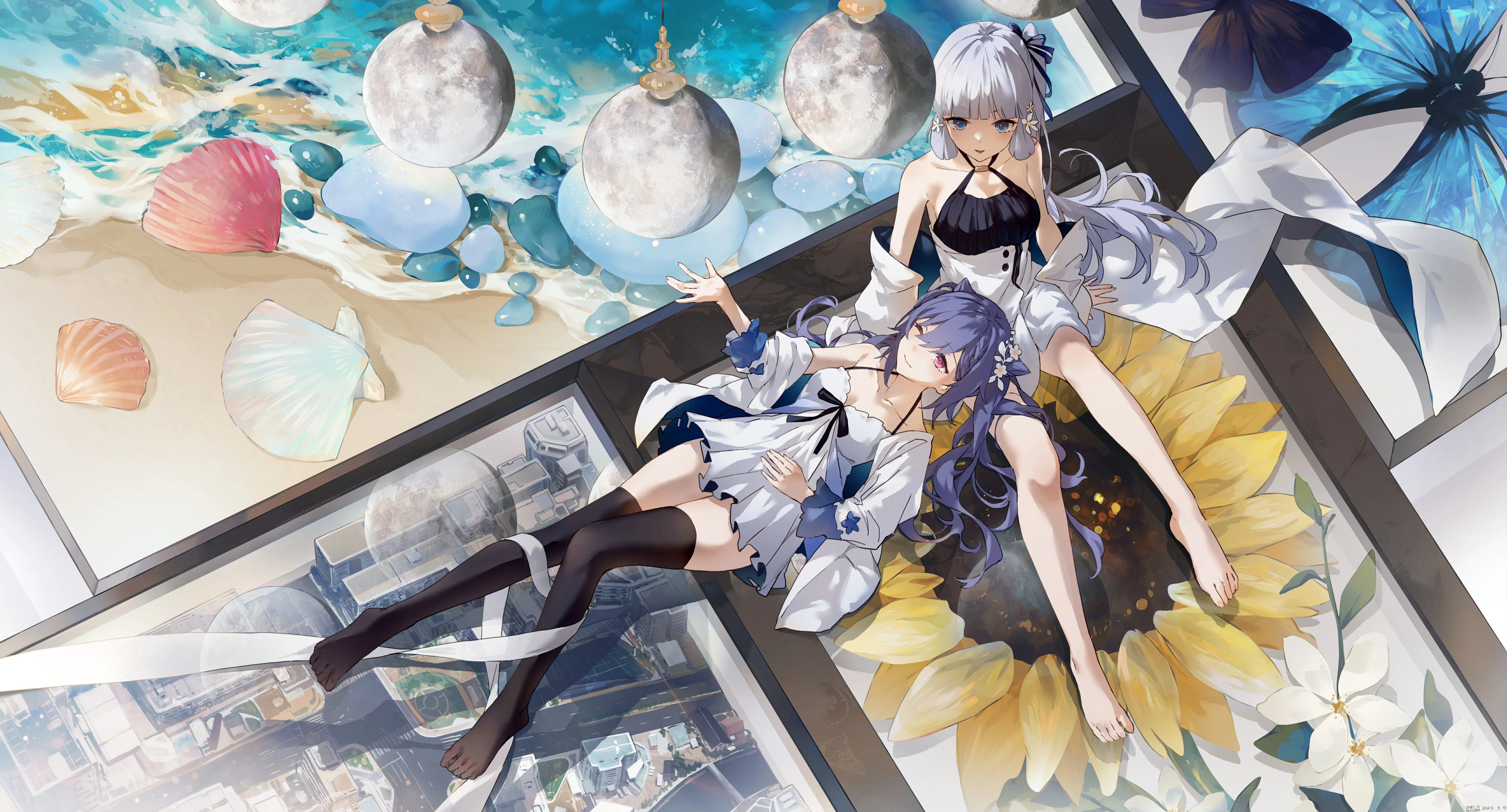 Long hair, smiling, lying, mole, foot, anime girl, Genshin, water, waves, beach, sunflower, fresh flowers, long socks, 4K wallpaper