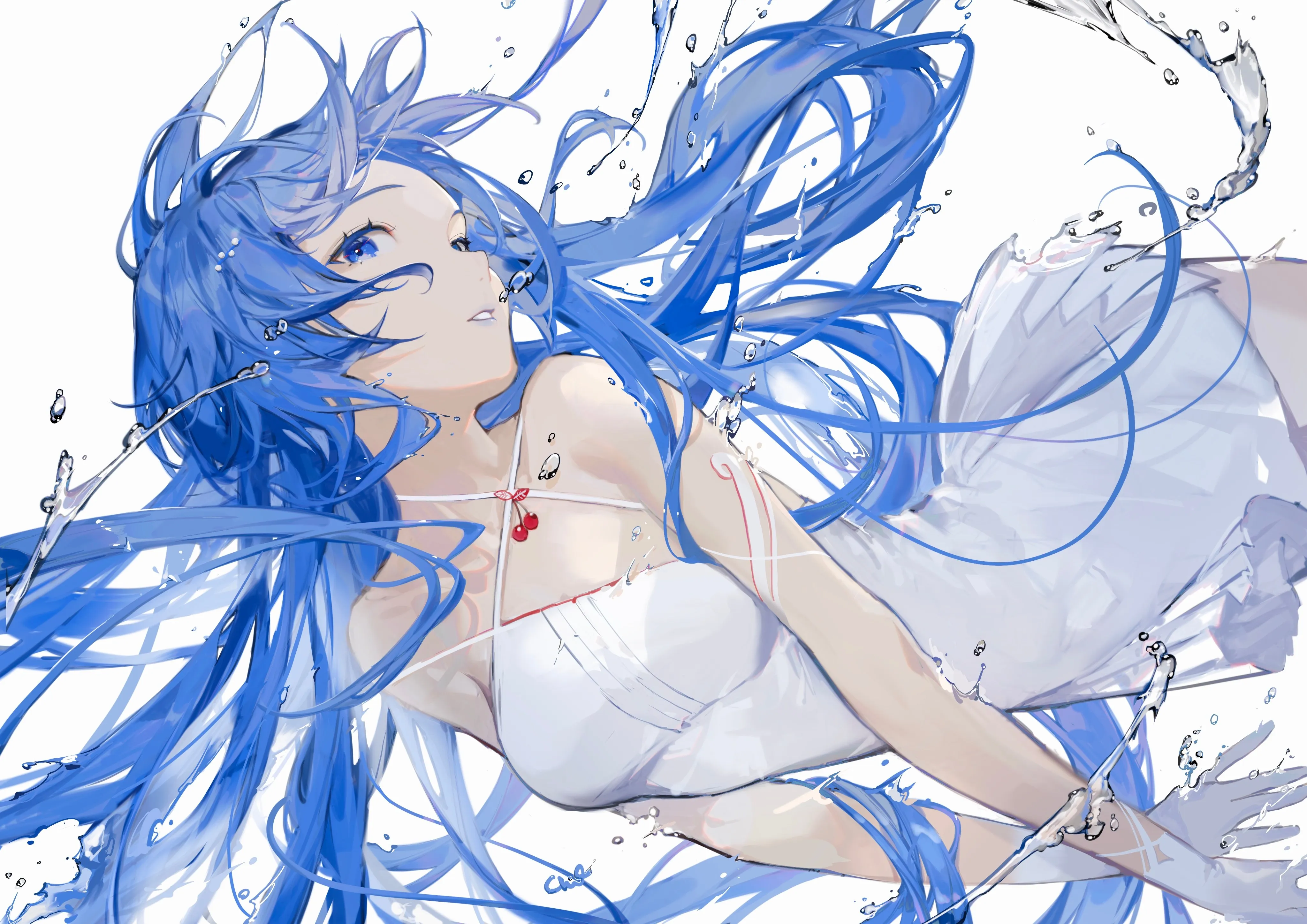 شعر أزرق، شعر طويل، عيون زرقاء، أنمي، فتاة، رش، ماء، نقطة ماء، خلفية بيضاء، قفازات بيضاء، فستان، فستان أبيض، خلفية 4K