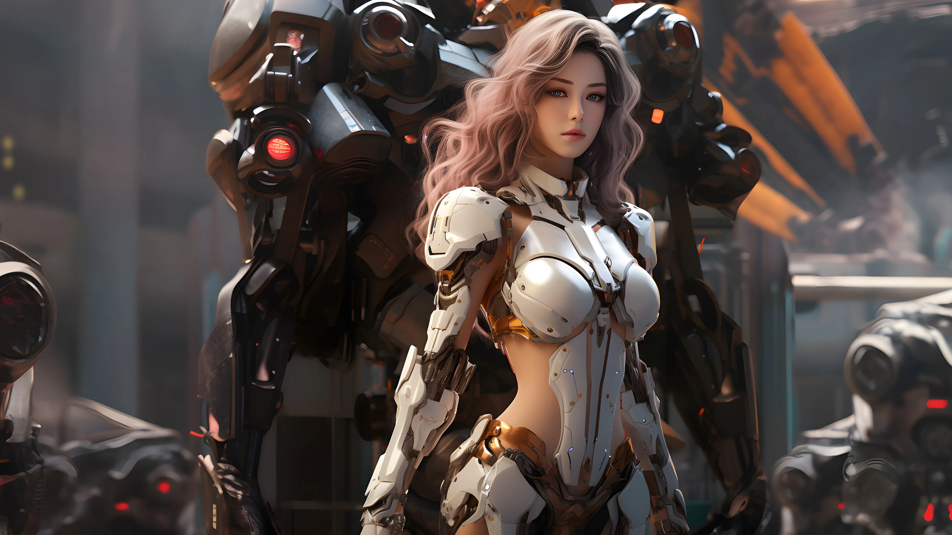 امرأة، شعر طويل، قائم، شعر ملفوف، الذكاء الاصطناعي، الروبوت، فن AI، تقنية، ورق جدران 4K