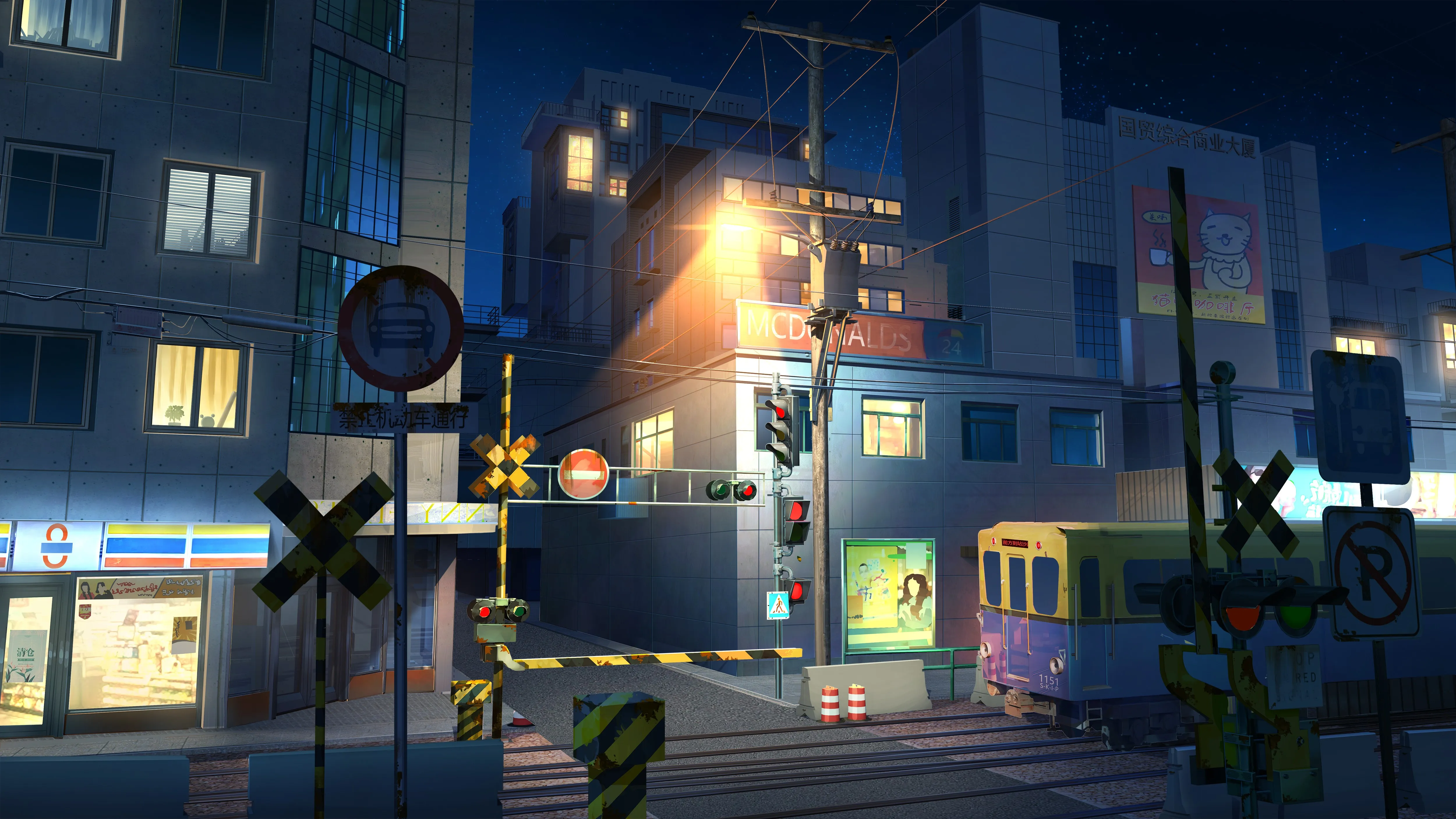 فن ذكاء اصطناعي، ليل، قطار، رصيف، إشارات المرور، شارع، مناظر طبيعية، ورق جدران 4K