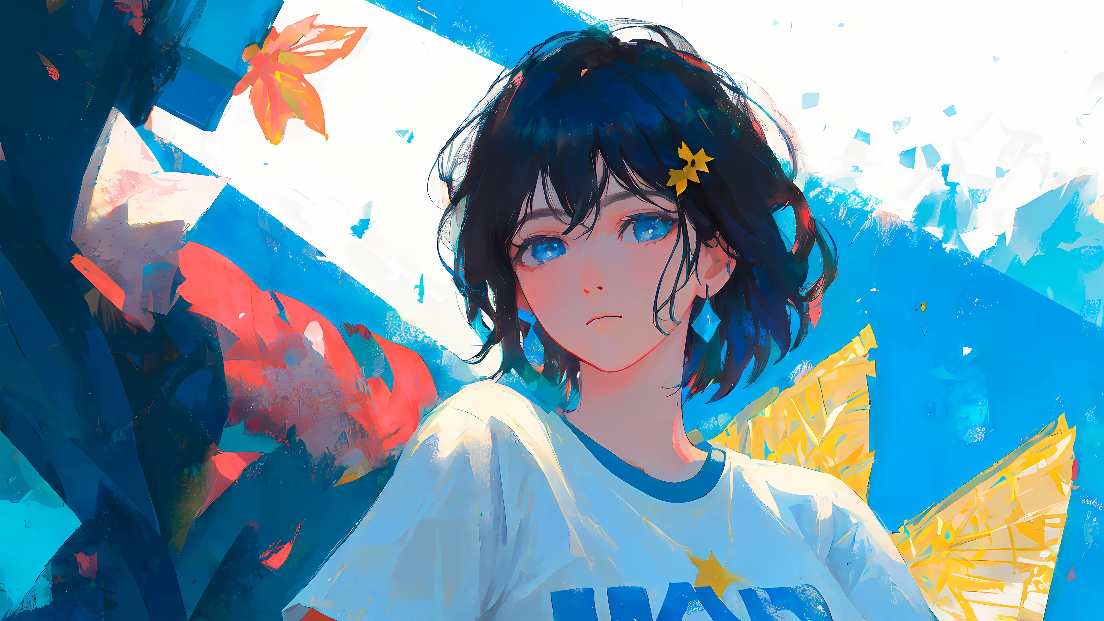 امرأة، عيون زرقاء، شعر داكن، رسوم متحركة، فتاة، أقراط، الذكاء الاصطناعي، الفن، حزن، ورق جدران 4K