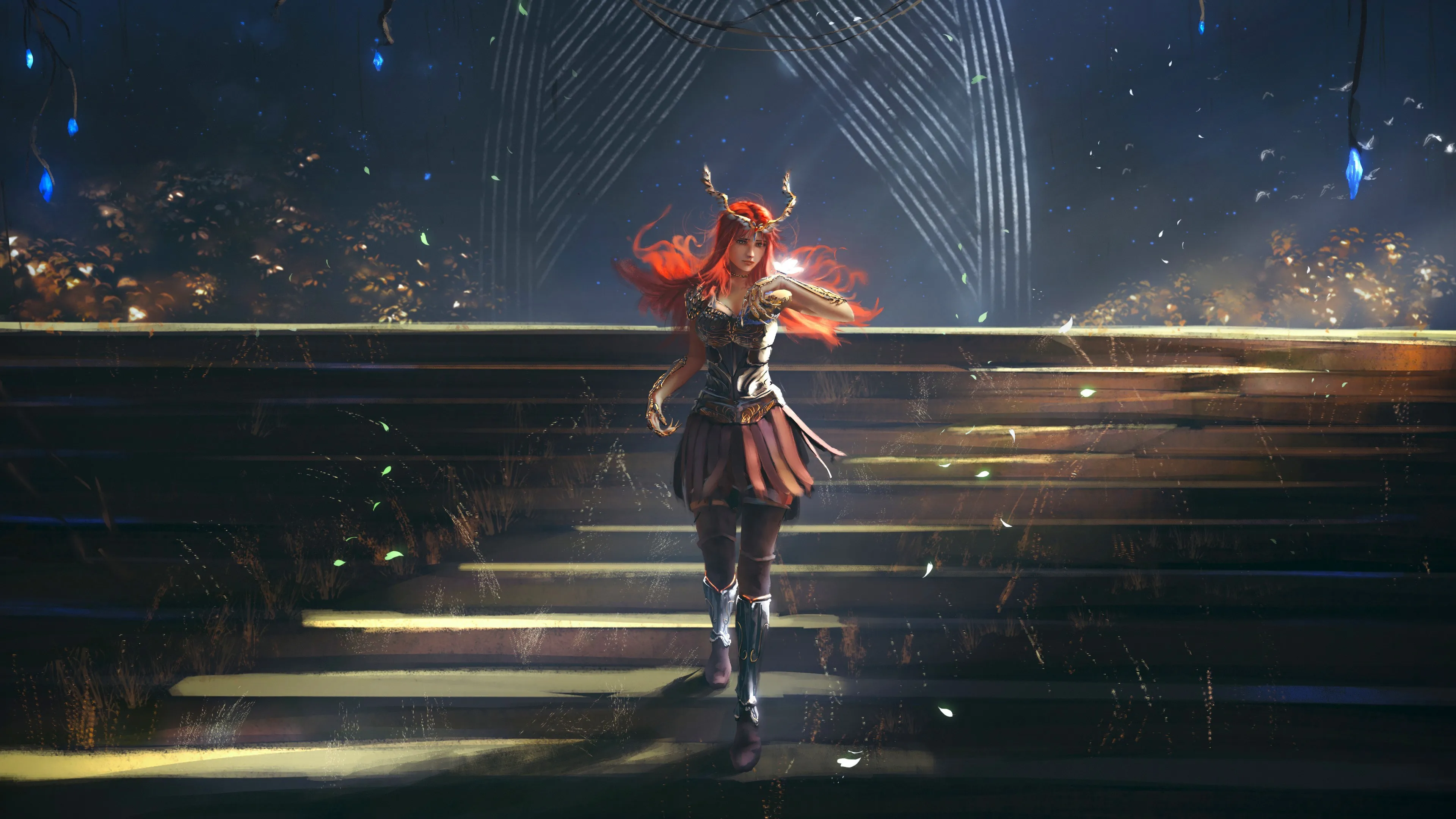Female, Woman, Girl, Red Hair, Artwork, Digital Art, Fantasy Art, Illustration, Stairs, Plants, Sunlight, Butterfly, Armor, Armored Boots, Glowing, Leaves, 4K Wallpaper
