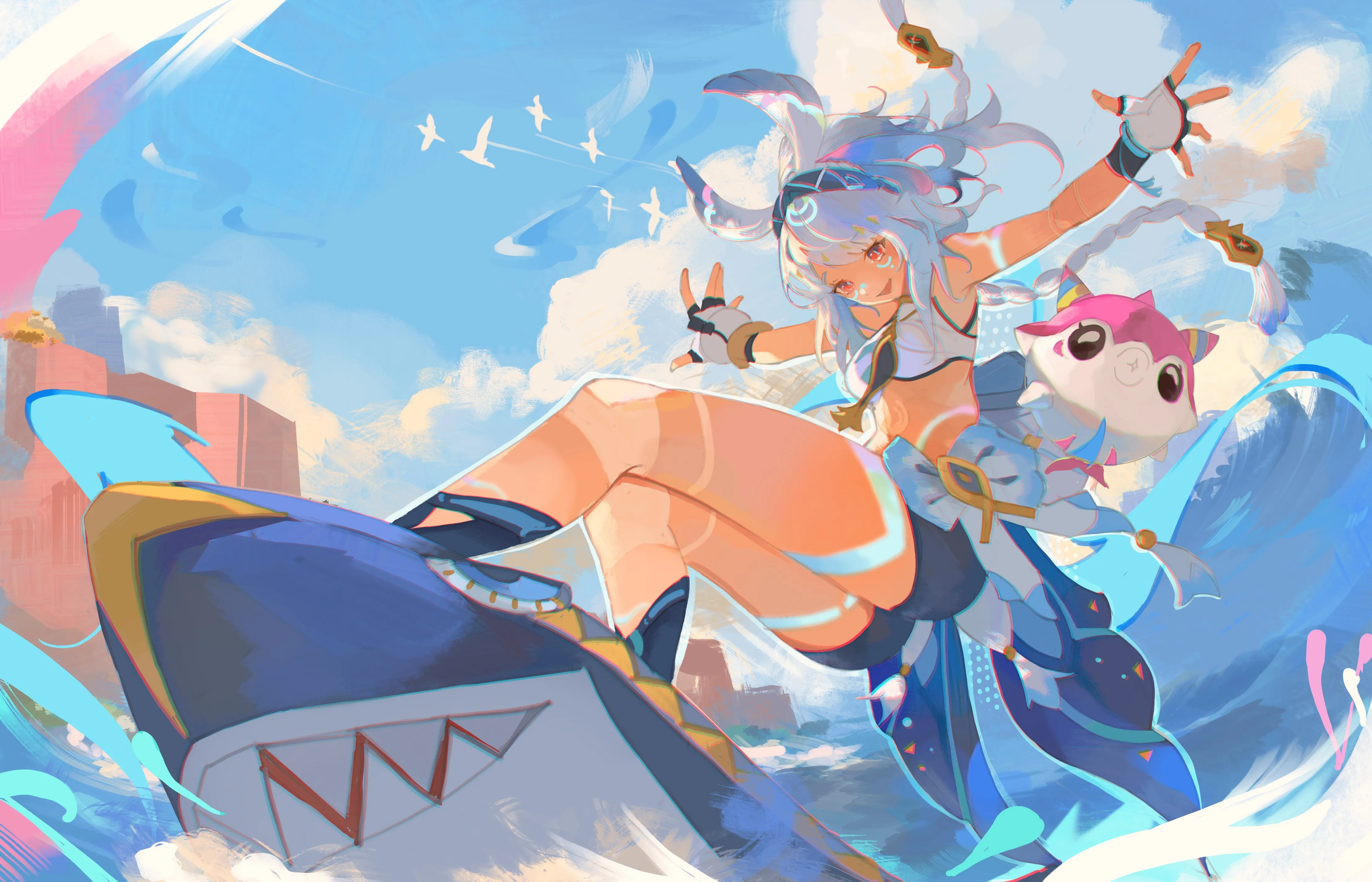 شعر طويل، خارجة، امرأة، شعر أبيض، عين حمراء، شعر ذيل، ساق، أنمي، فتاة، غيمة، قفاز، سماء، ركوب الأمواج، حزام رأس، ماء، أسنان حادة، طيور، ورق جدران 4K
