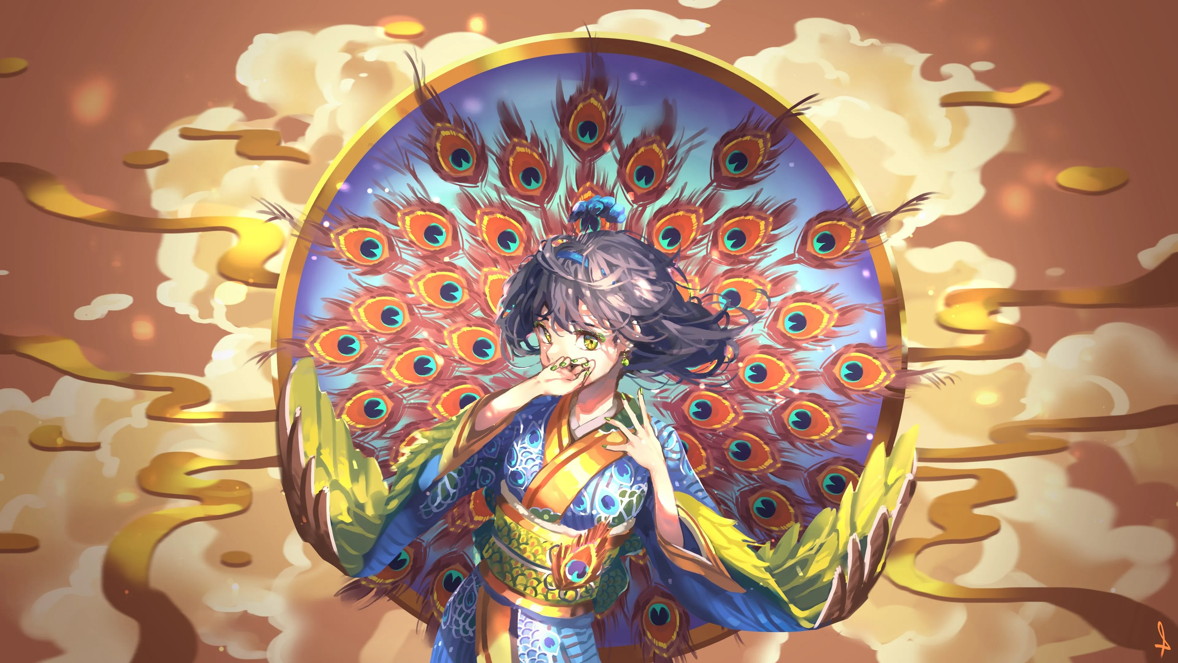 فتاة خيالية، فتاة أنمي، ريش النسر، فن خيالي، ملابس تقليدية، أنمي، خلفيات 4K