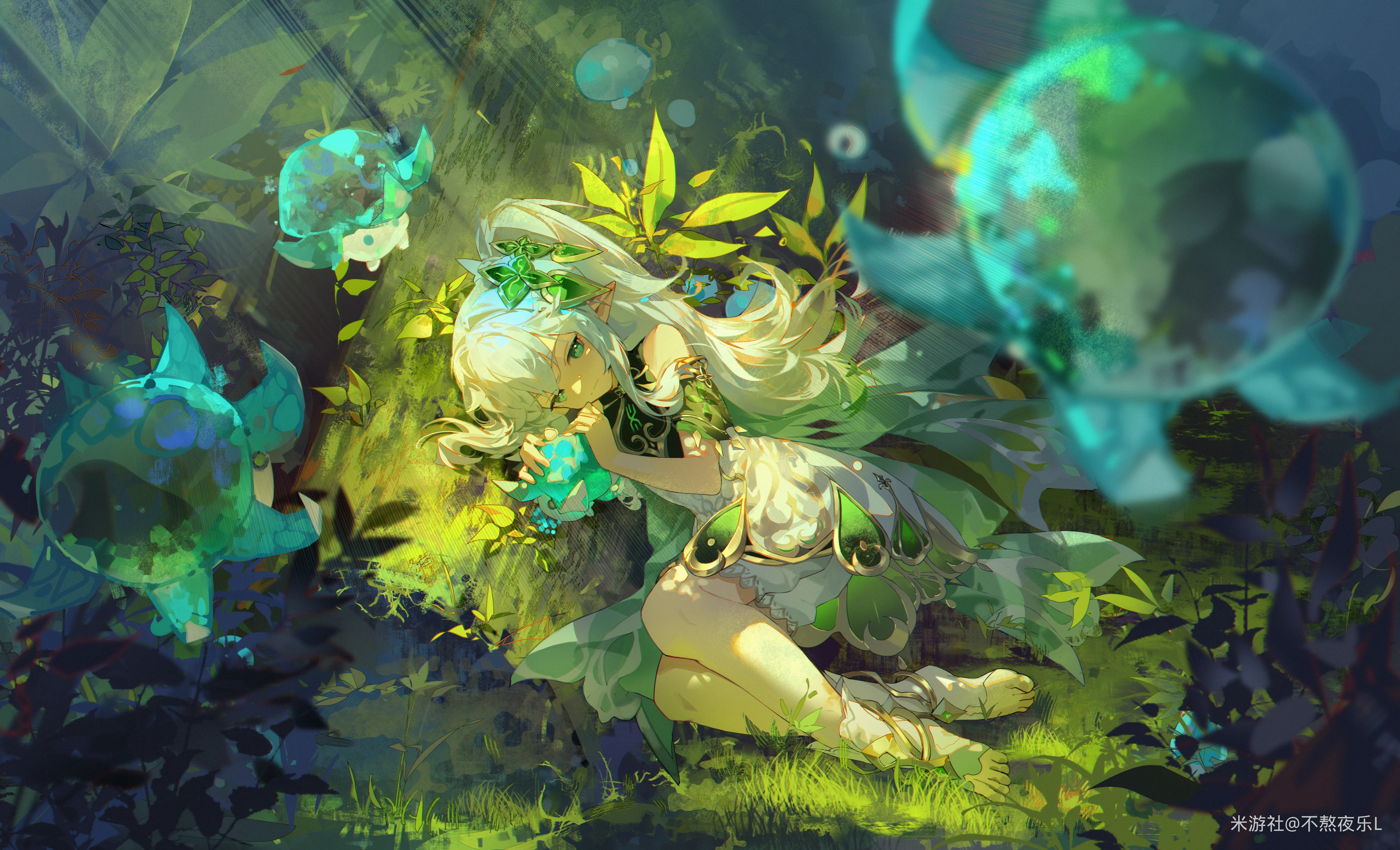 Long hair, green eyes, anime, girl, grass, leaves, animal ears, 8K wallpaper