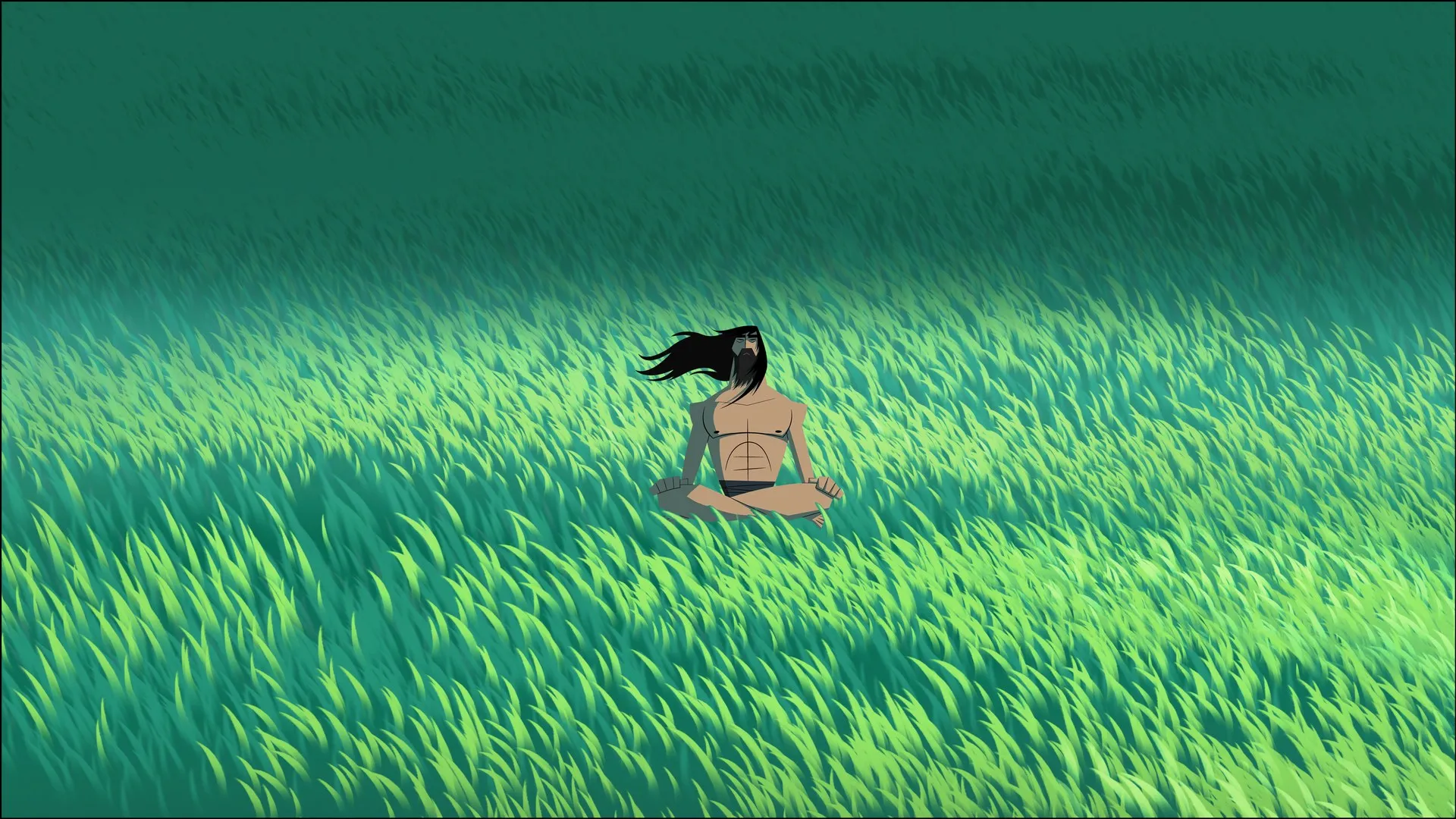شعر داكن، شعر طويل، جالس، عينان مغلقة، ساقان متقاطعتان، كرتوني، طبيعي، ميدان، أخضر، رجل، يُمارس التأمل، عشب، فن آلي، السباحة البالغة، شبكة كرتونية، جاك الساموراي