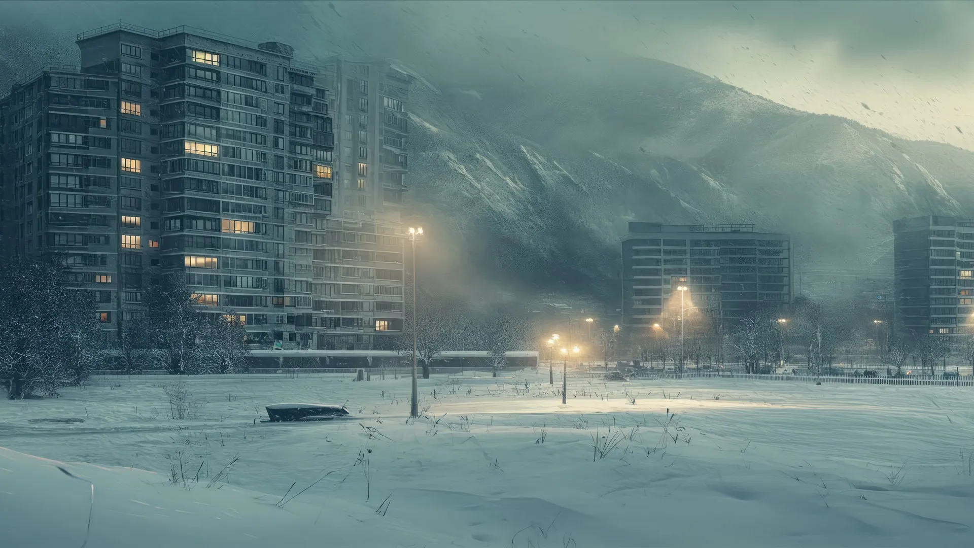 ثلج زاوية واسعة مدينة مناظر طبيعية في الطريق 冬季节日 数字 فن حاسوب خلفيات 4K