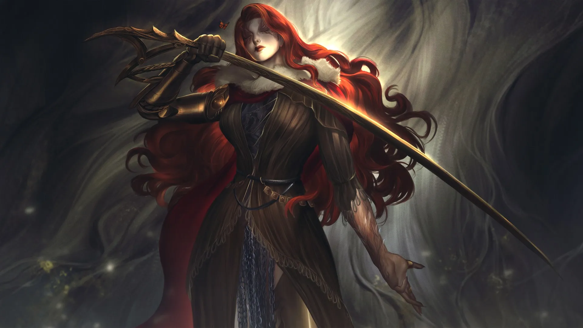 شعر طويل شعر أحمر شعر مروي سيف فيديو لعبة فتاة شخصية رسم توضيحي رسم فن فراشة ورق جدران 4K
