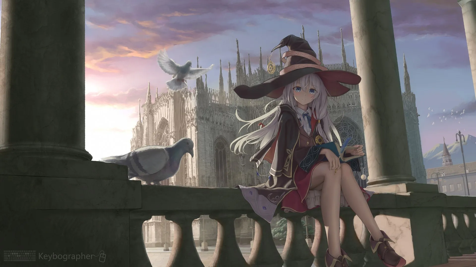 ساحرة عينان زرقاء جالسة فتاة كرتونية كرتون ساحرة قبعة ساحر شعر فضي خلفيات سطح المكتب 4K خلفيات