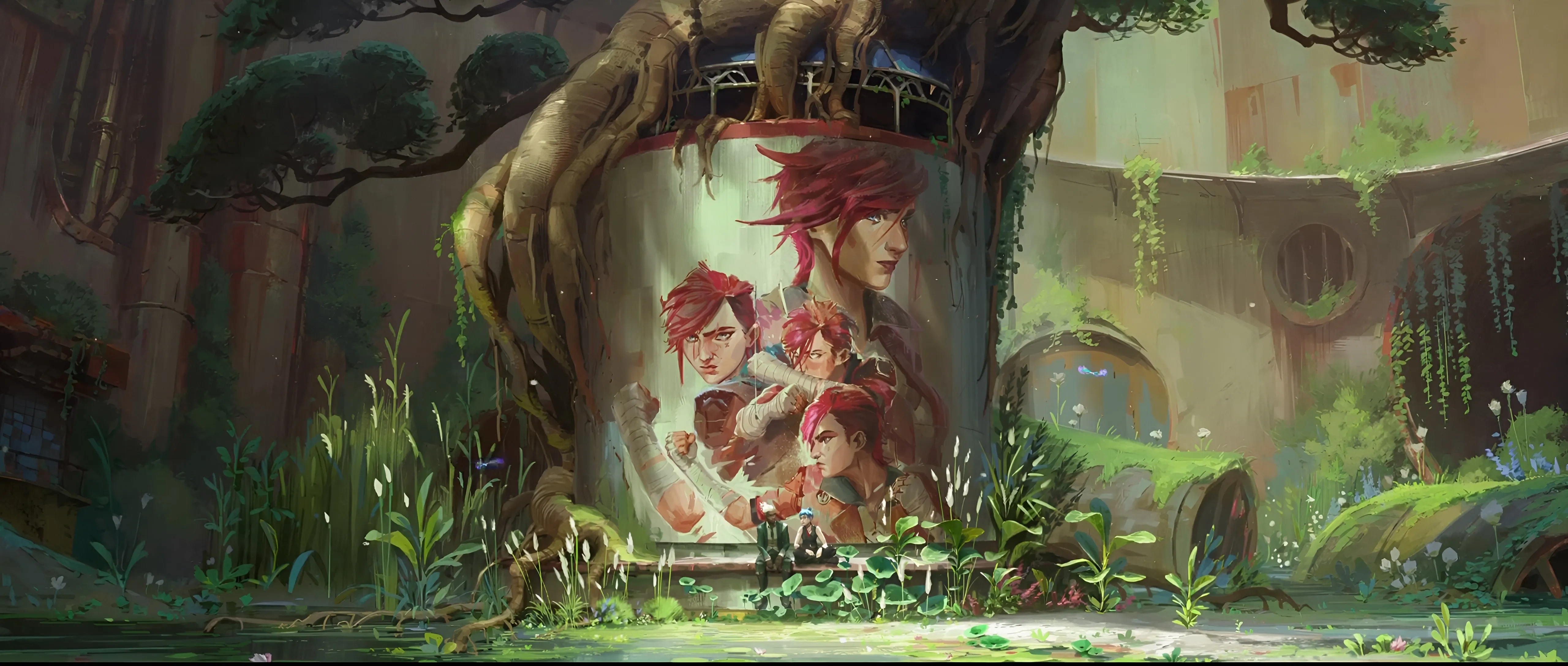 League of Legends، لعبة، فتاة، شعر أحمر، جالس، فتى، معركة المدينتين، مسلسل، عرض واسع، شاشة عريضة، أوراق الشجر، ضوء الشمس، ورق جدران 4K