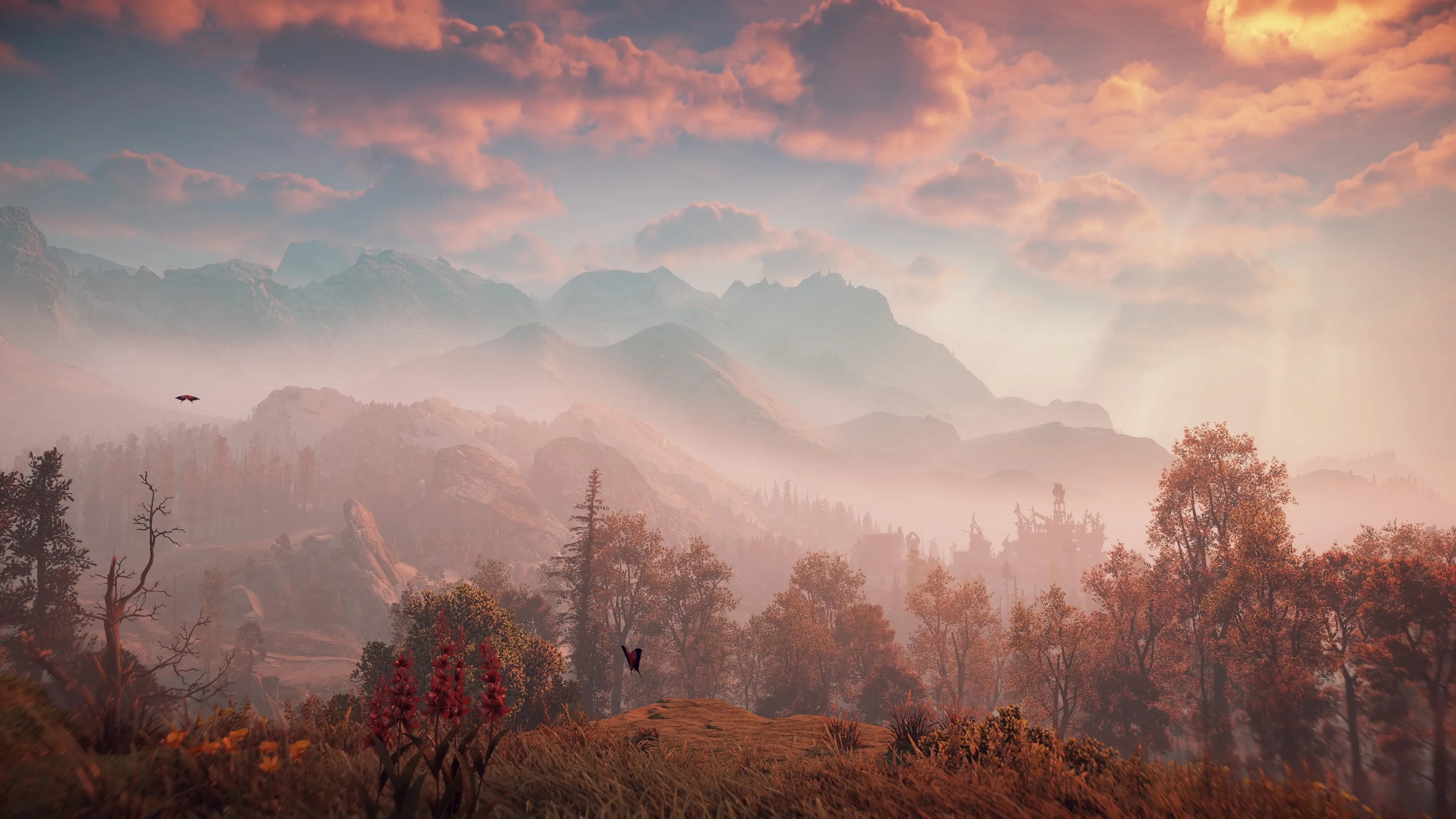 المناظر الطبيعية، الفجر، المناظر الطبيعية، لقطة شاشة، لعبة إلكترونية، جبال، غابات، أشجار، غيوم، ضوء الشمس، السماء، CGI، ورق جدران 4K