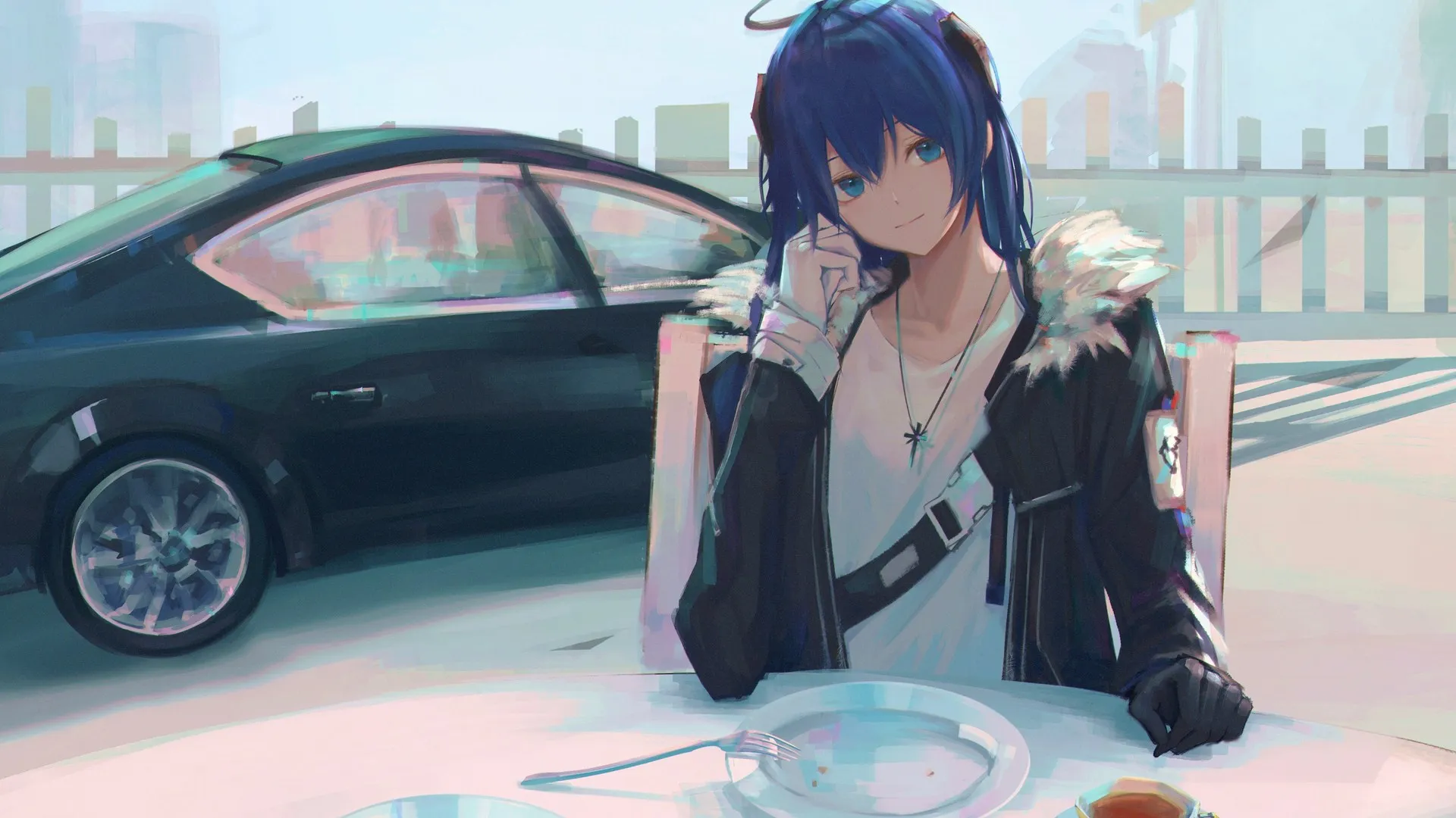 شعر أزرق عينين زرقاء فتاة أنمي فارس سيارة لصق الحاسوب 4K