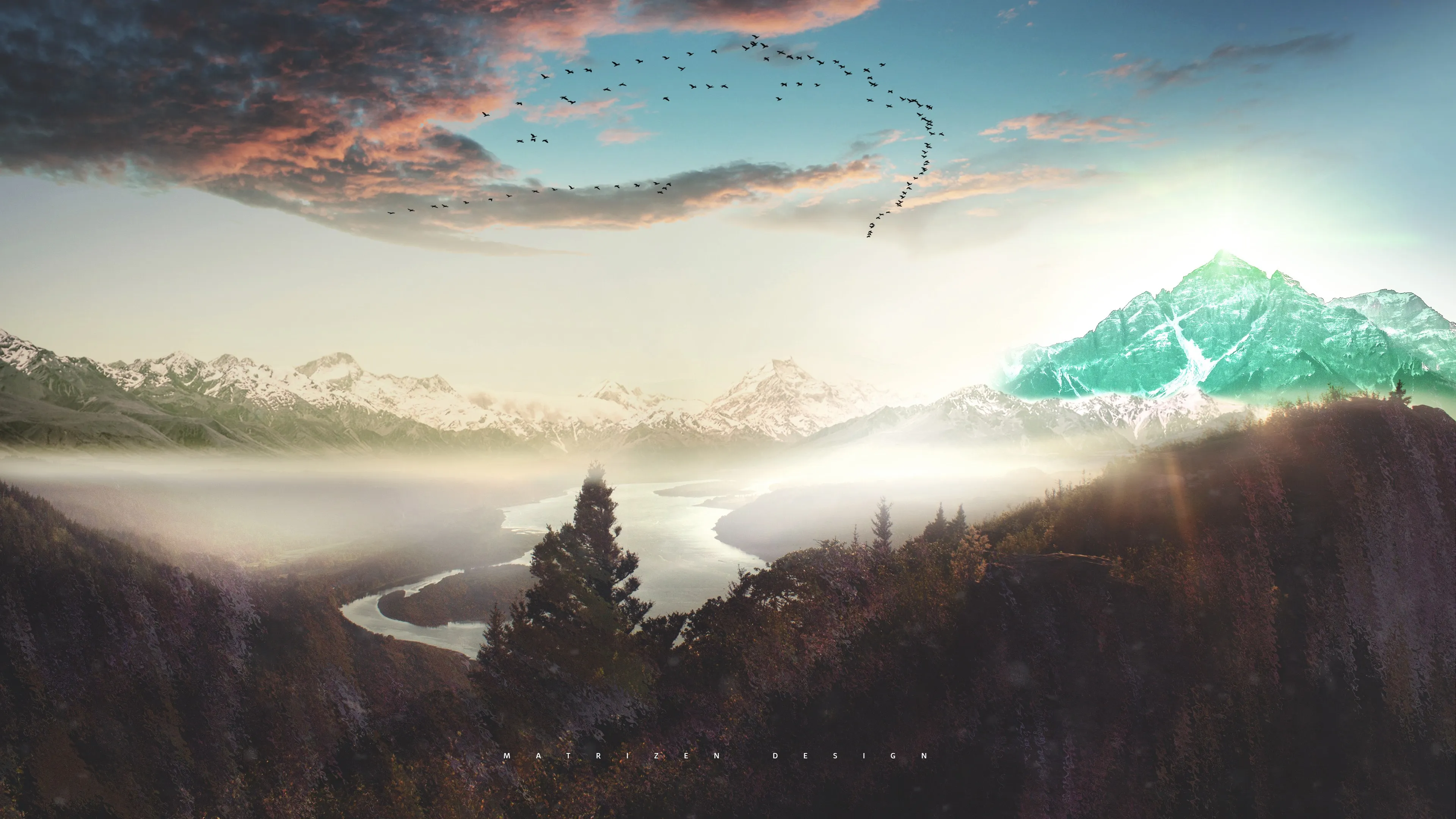تصميم صور جبل غيمة نهر غابة مناظر طبيعية طبيعة ثلج ضباب غروب الشمس فن ذكاء اصطناعي فن مفهومي 4K wallpaper
