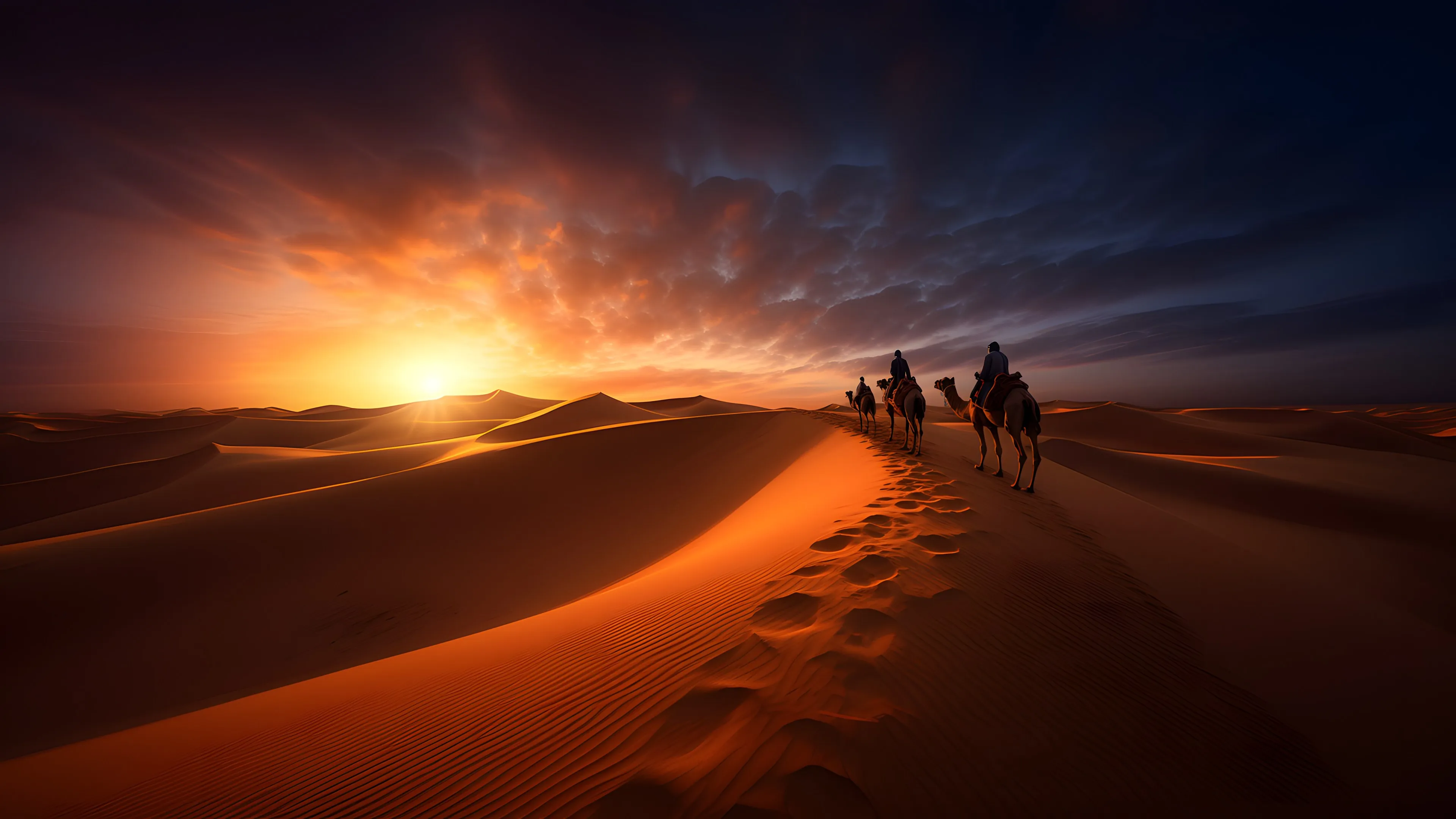 الصحراء الفن الرمل غروب الشمس غروب الشمس السماء السحب فن الذكاء الاصطناعي حيوانات زراعة الحاسوب 4K wallpaper