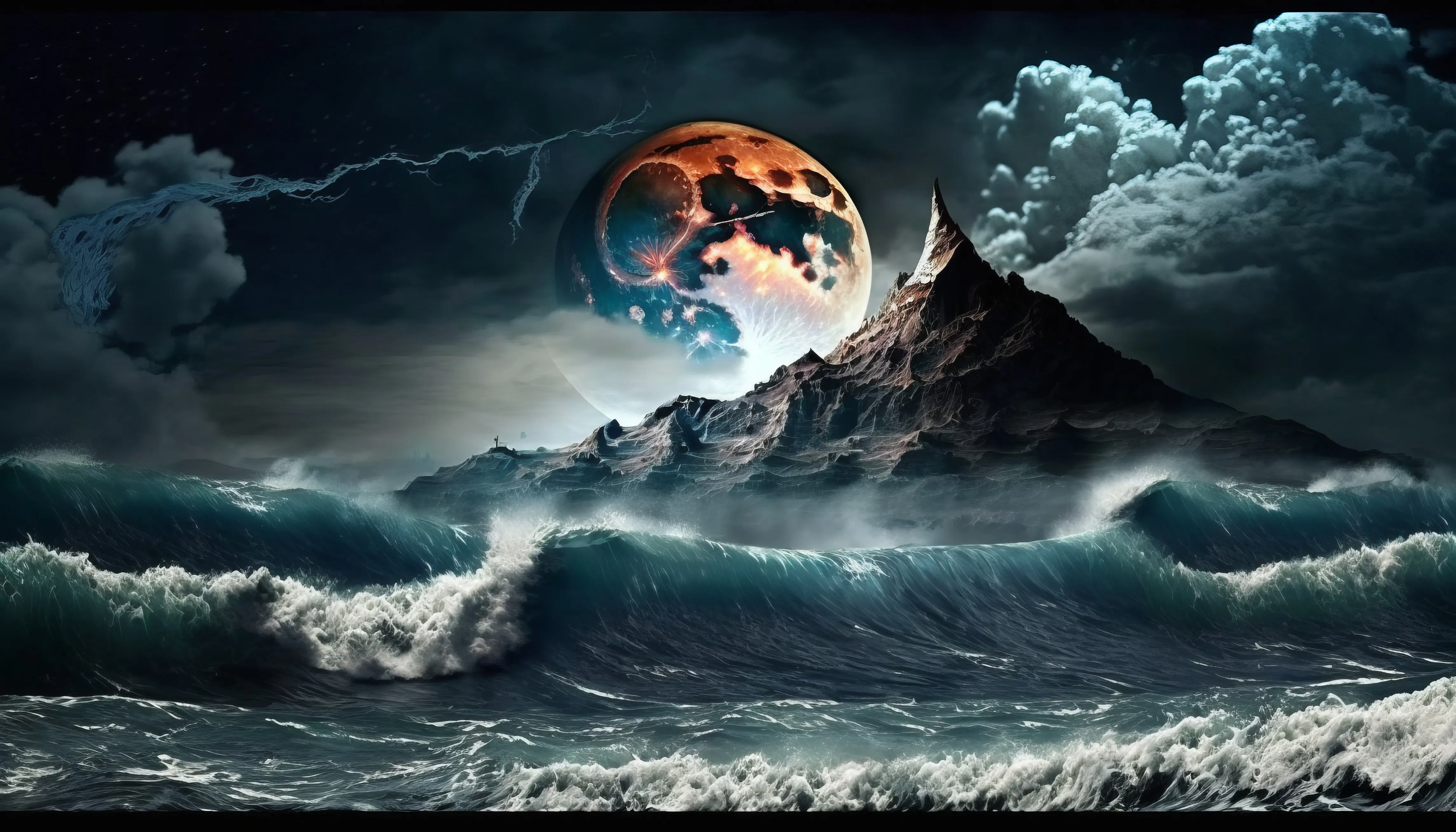 فن ذكاء اصطناعي، رسم، القمر، الأمواج، البحر، الجبال، السحب، الماء، خلفيات سطح المكتب، خلفيات 4K