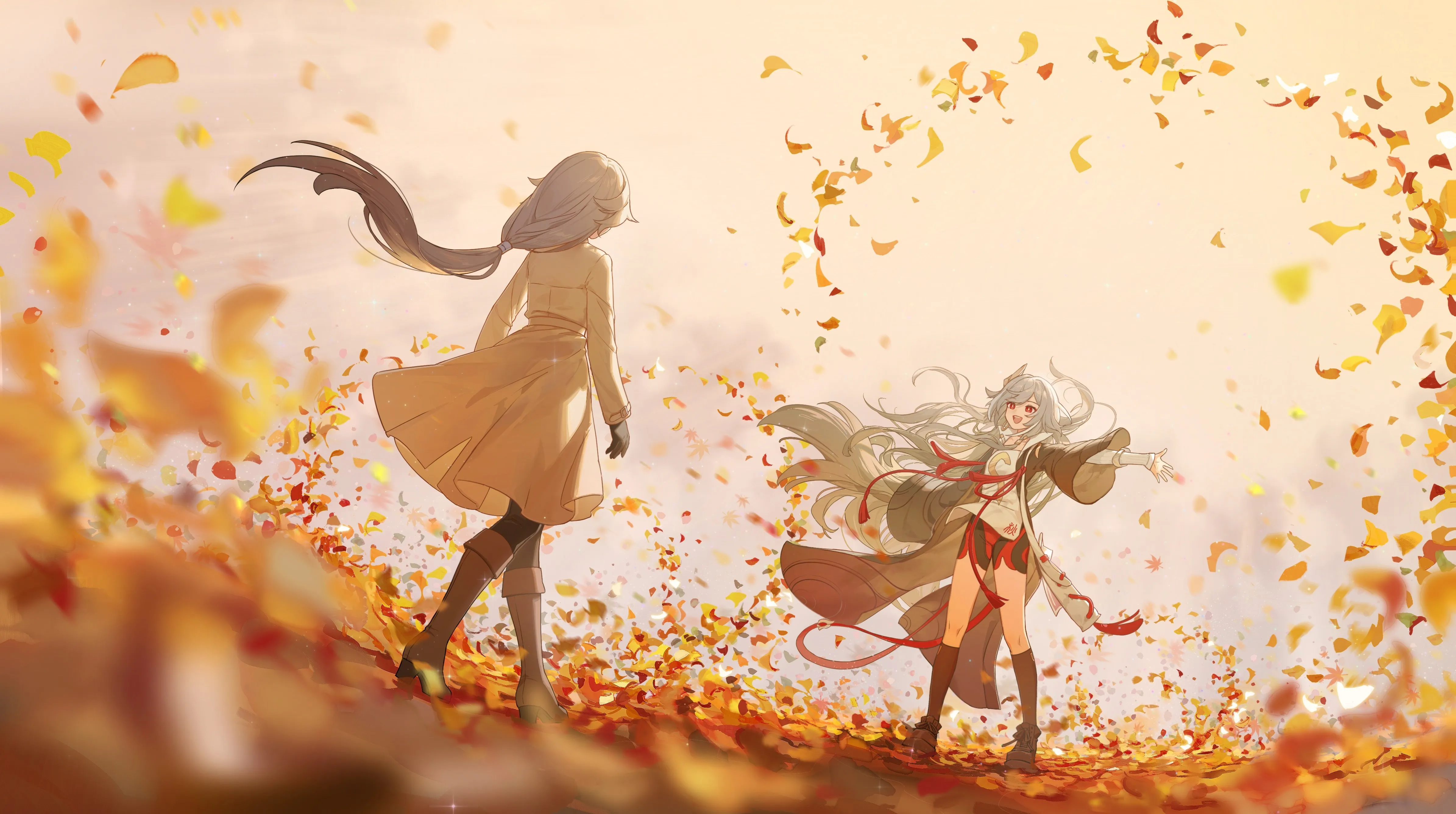 فوهاو ألوان عيني حمراء أنمي فتاة خريف شعر فضي برتقالي فخذ خلفيات سطح المكتب 4K خلفيات