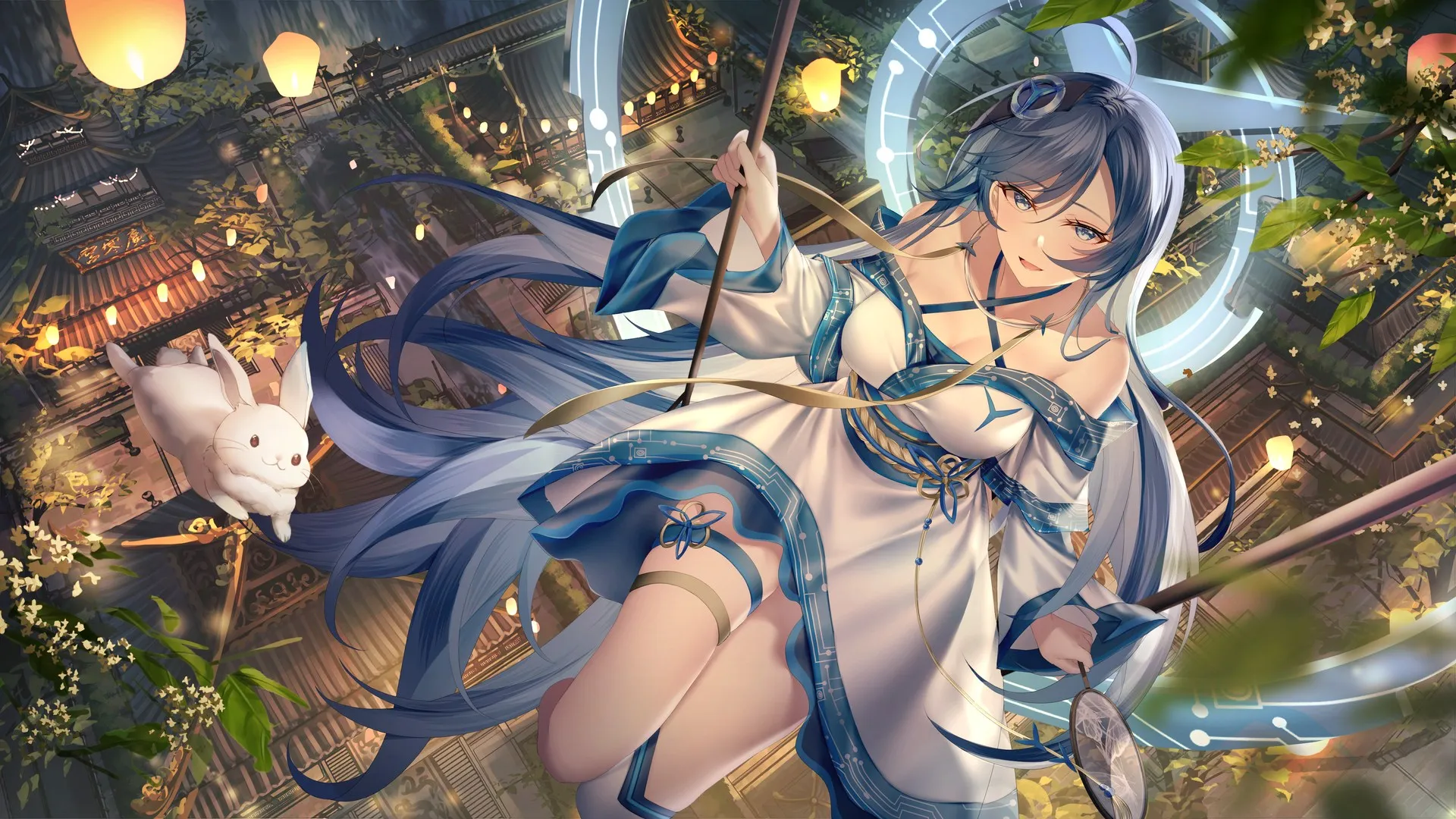 شعر أزرق، شعر طويل، عيون زرقاء، كتف، فستان أبيض، فتاة كرتونية، ملابس صينية، لصق سطح المكتب، لصق 4K