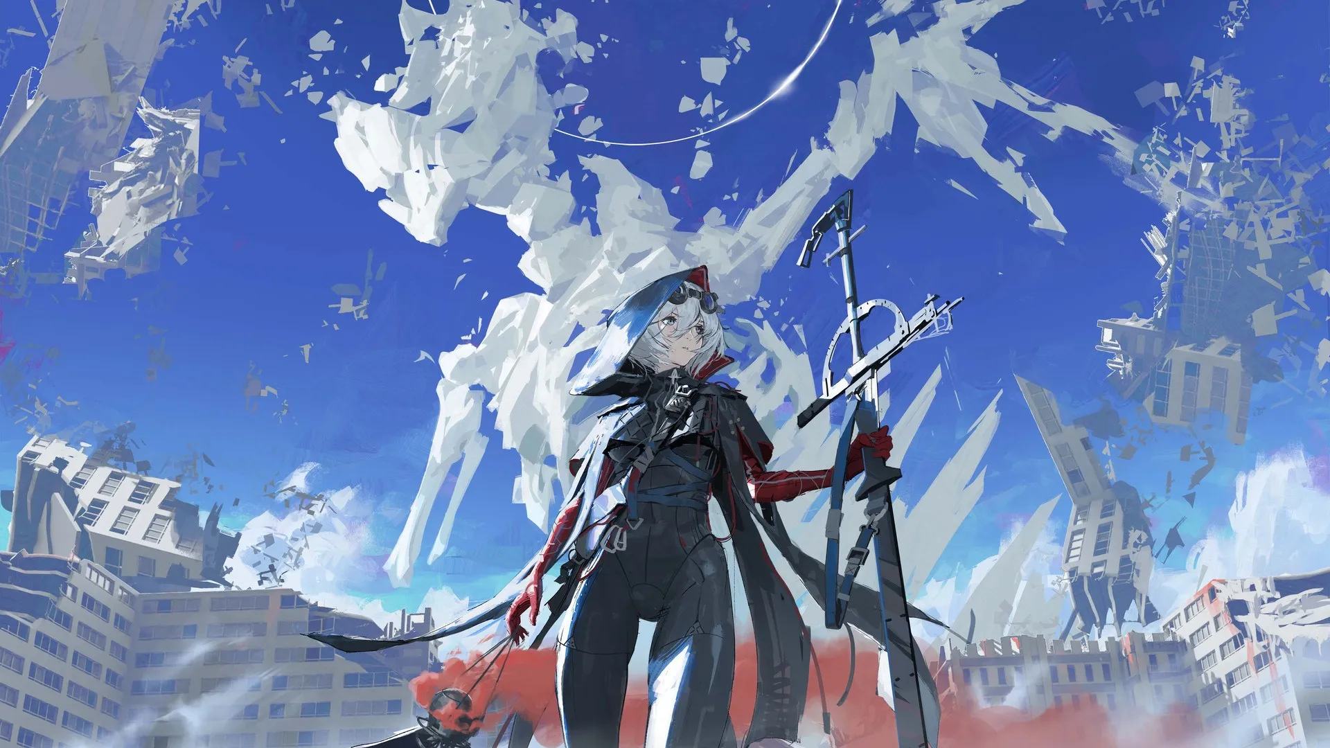 النظر بعيداً، شعر قصير، وقوف، قميص ضيق أسود، سلاح، قفازات معصم، زاوية منخفضة، شعر رمادي، السماء، صورة لسطح المكتب للكمبيوتر، صورة عالية الدقة 4K