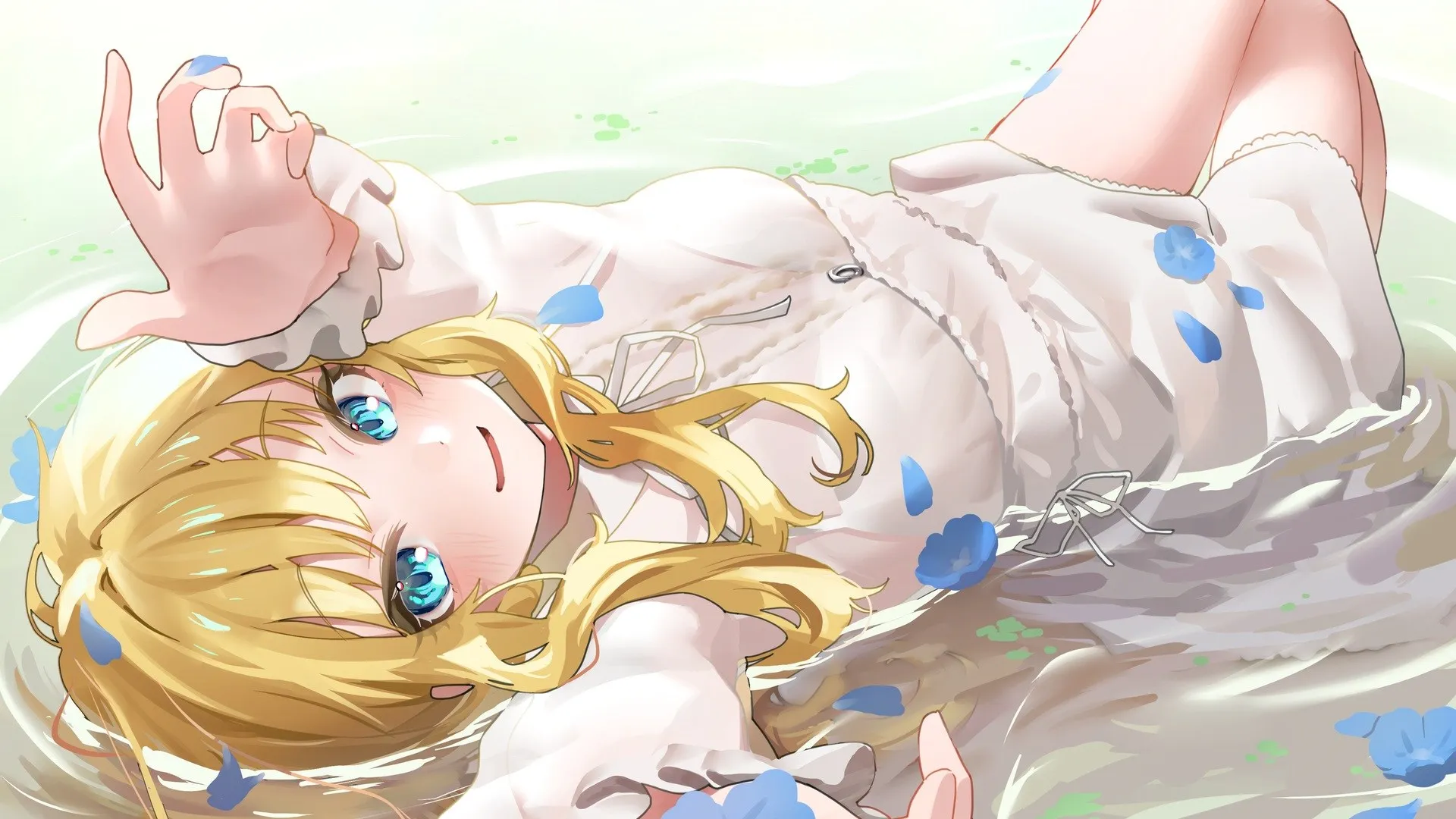النوم على الظهر، ابتسامة، عينين زرقاء، أنمي، فتاة أنمي، فستان، صورة شاشة الحاسوب، بصريات 4K