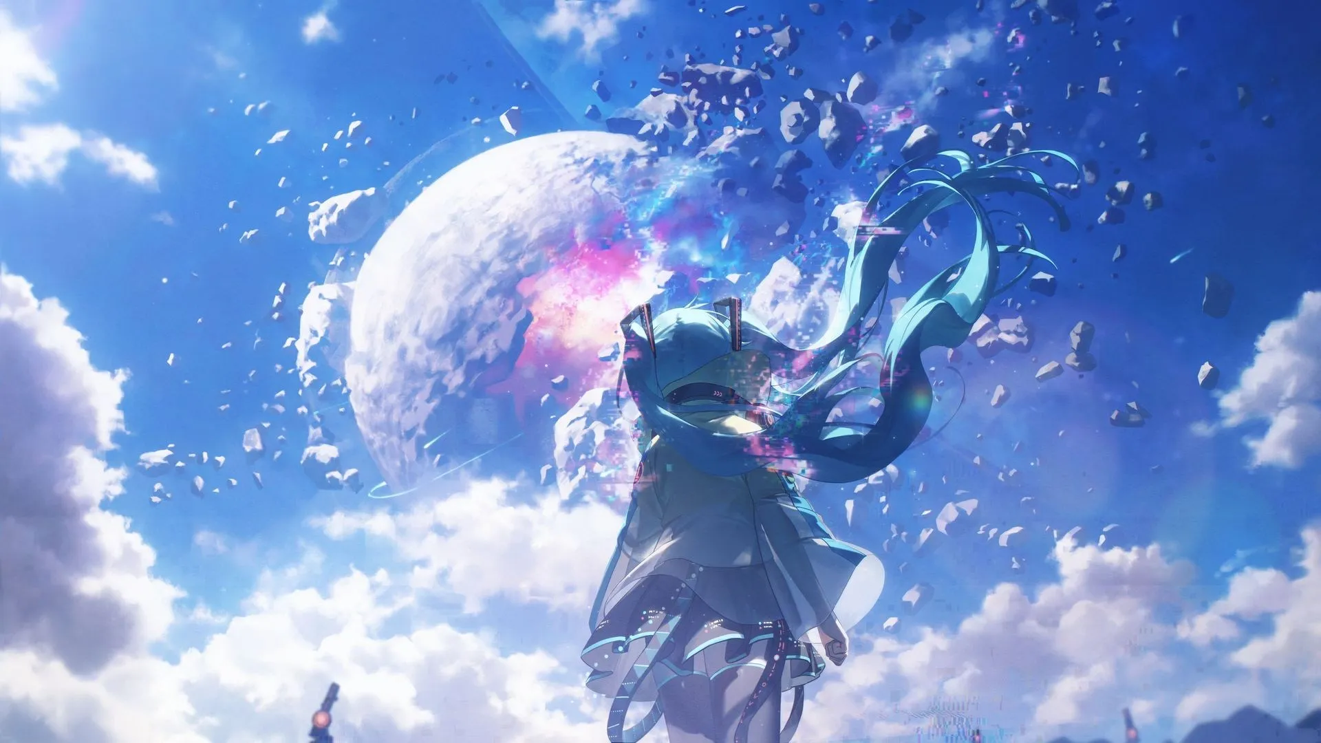 نظرة إلى أعلى، وقوف، شعر أزرق، شعر طويل، أنمي، كمان، مينو، كمان، فتاة أنمي