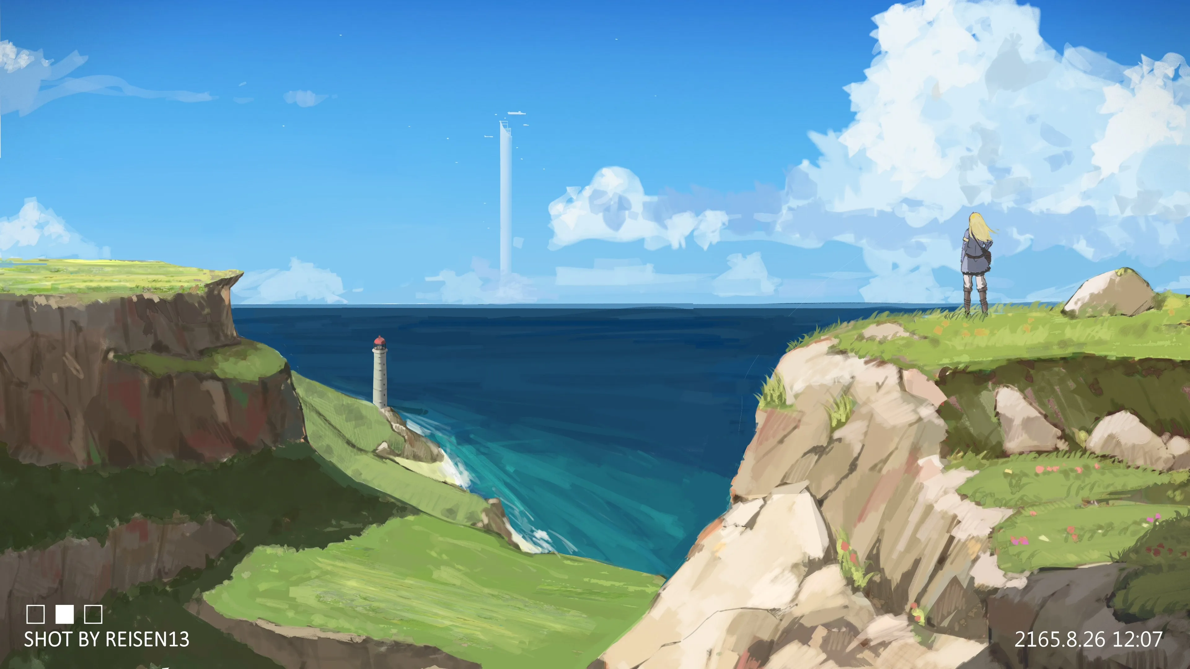 ليزين البحر البرج الفتاة الفتاة السحابة العشب النظر 4K لصق الجدران
