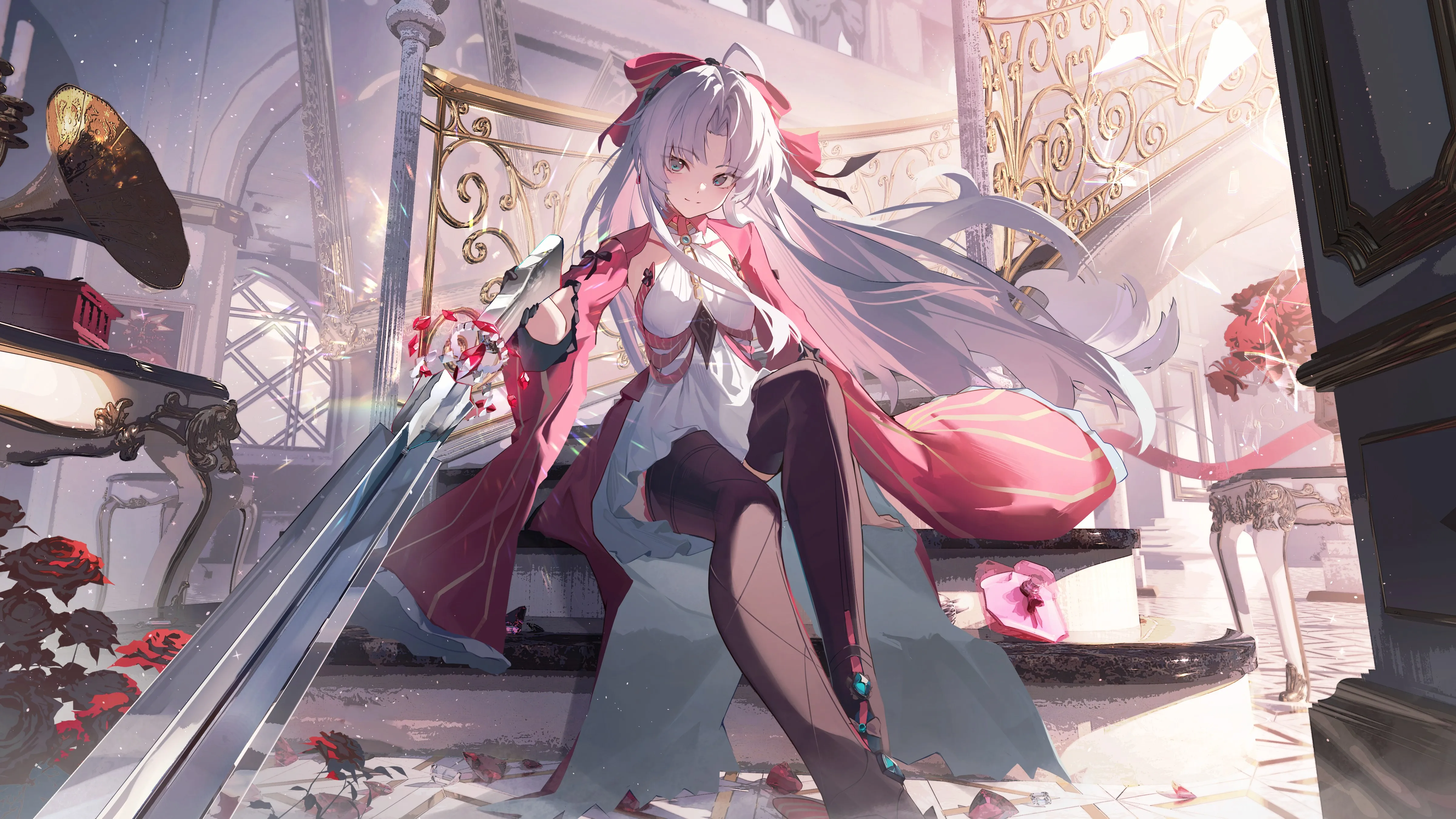 جلسة، مسدس، فتاة، شعر طويل، شعر أبيض، ابتسامة، أنمي، فتاة، هبوب موجة، سلالم، زهور، فستان، سلاح، وردة، ضوء الشمس، ساق طويلة، كعوب، قفازات سوداء، قفازات، خلفيات 4K
