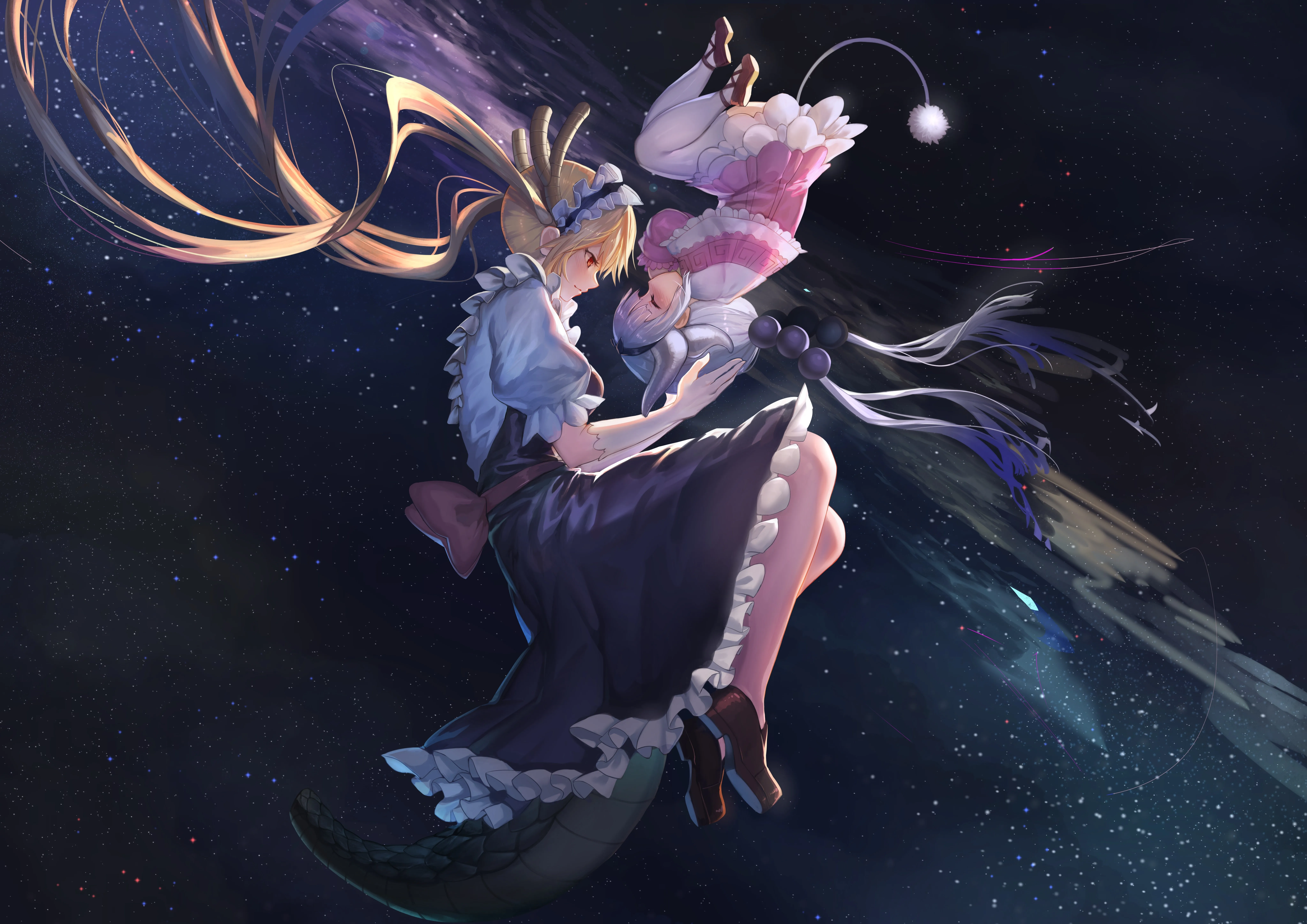 Long hair, White hair, Hair, Red eyes, Smile, Blonde, Rui from the Rui Family, Anime, Girl, Space, Twin tails, Universe, Maid, Clothing, Lolita, Pink dress, White stockings, Dragon girl, Angle, Sleeping, 8K Wallpaper