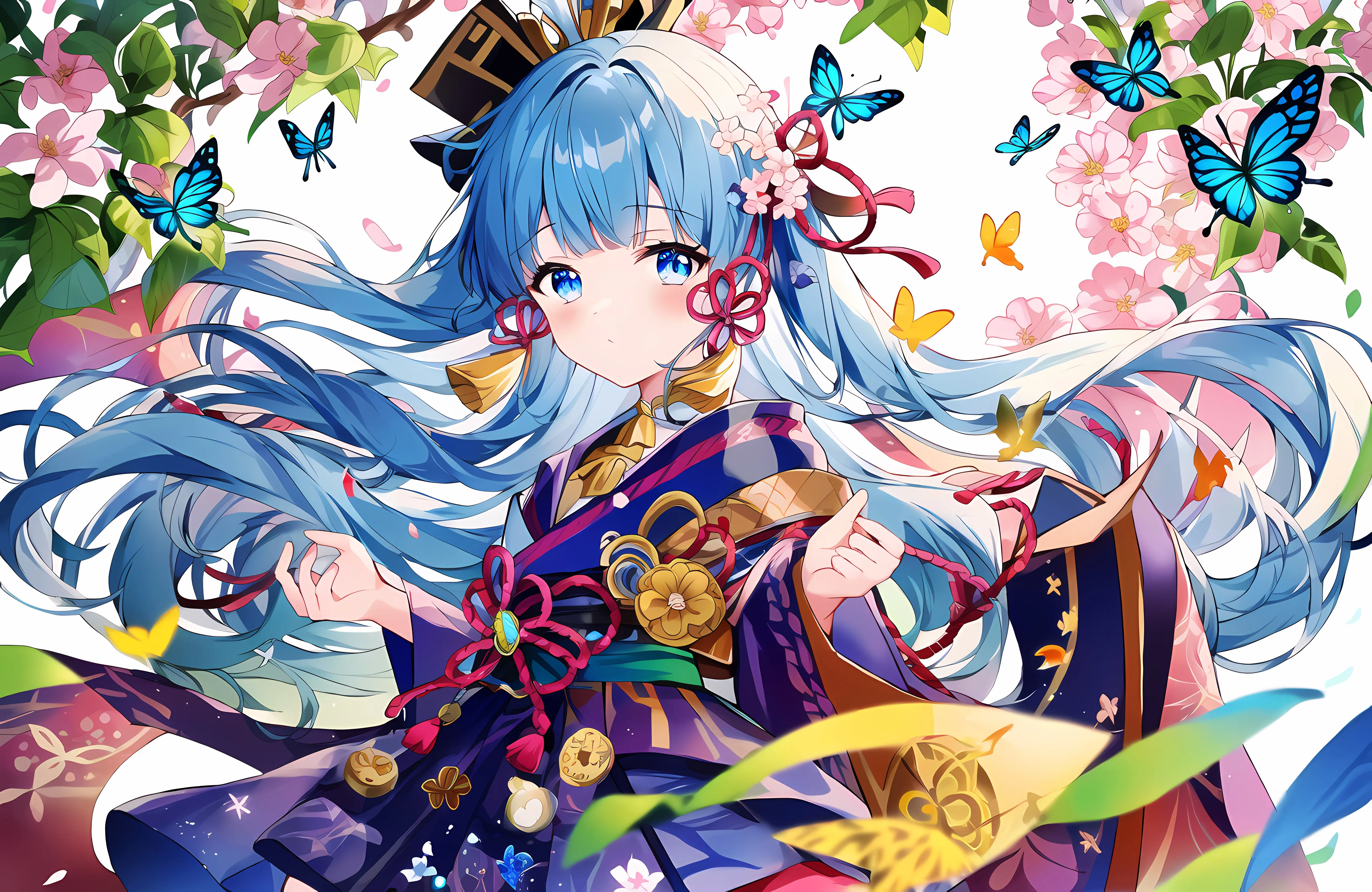 شعر أزرق عيون زرقاء شعر طويل أنمي فتاة جينشين فراشة زهور كيمونو أوراق زهور ملونة 4K wallpaper