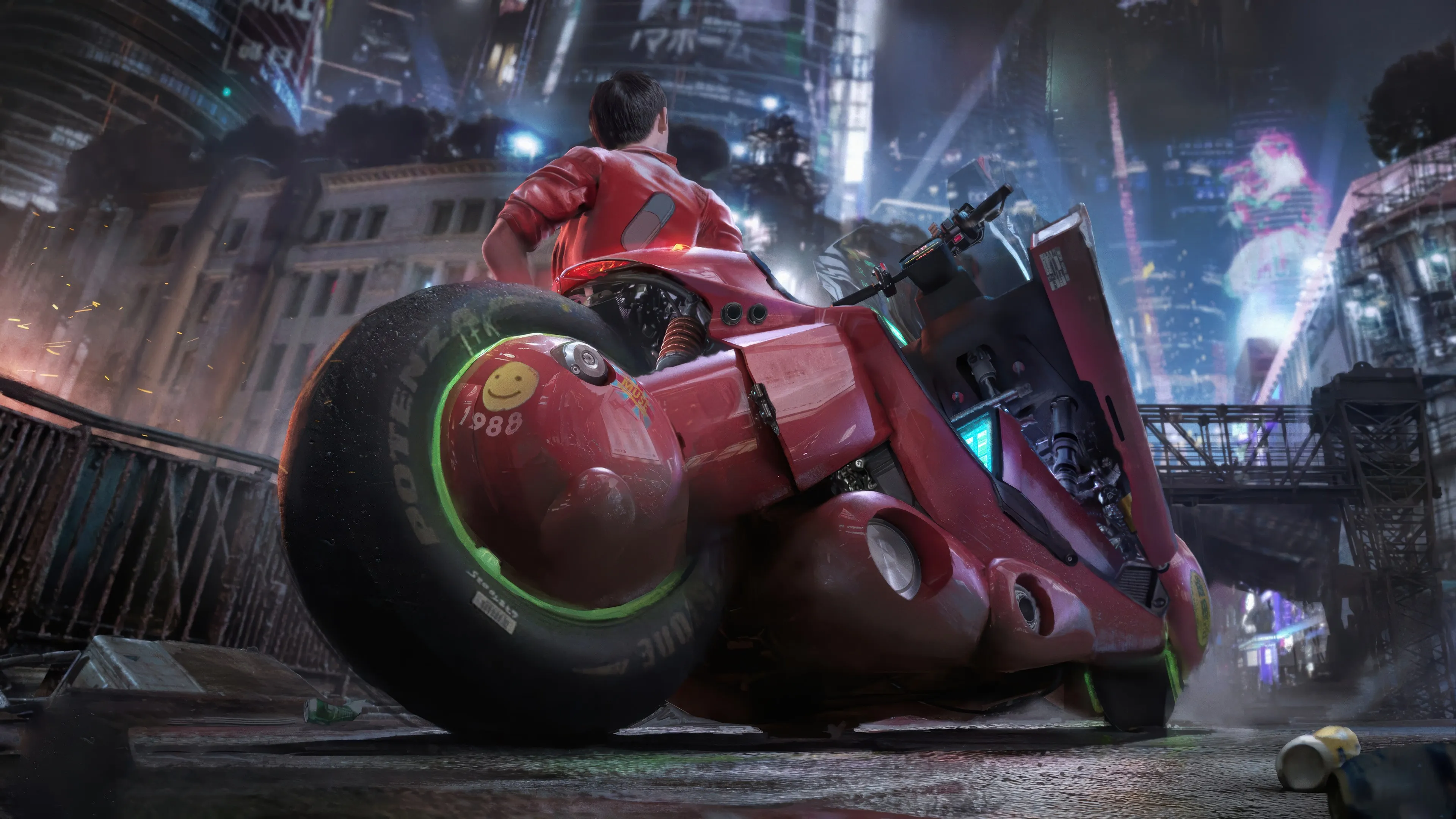 كريس شعر قصير رجل دراجة نارية رسوم متحركة مدينة سترة ضوء بناء مستقبلية ورق جدران 4K
