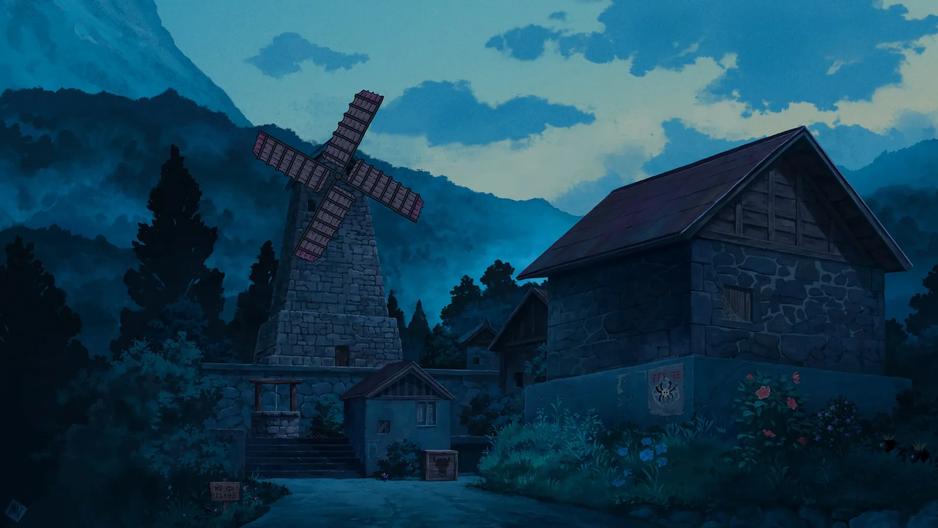 مات فينس، فن آلي، رسم، مناظر طبيعية، مدينة، ليل، غيمة، طاحونة هوائية، شجرة، خيال السلدية، السماء، كاكاريكو