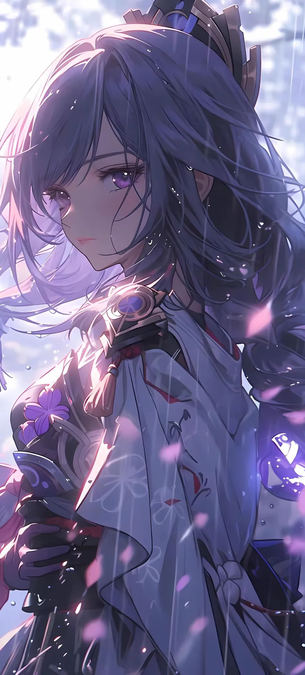 Anime girl, purple eyes, rain, weapon, sword, petals, art, mobile wallpaper, 8K wallpaper