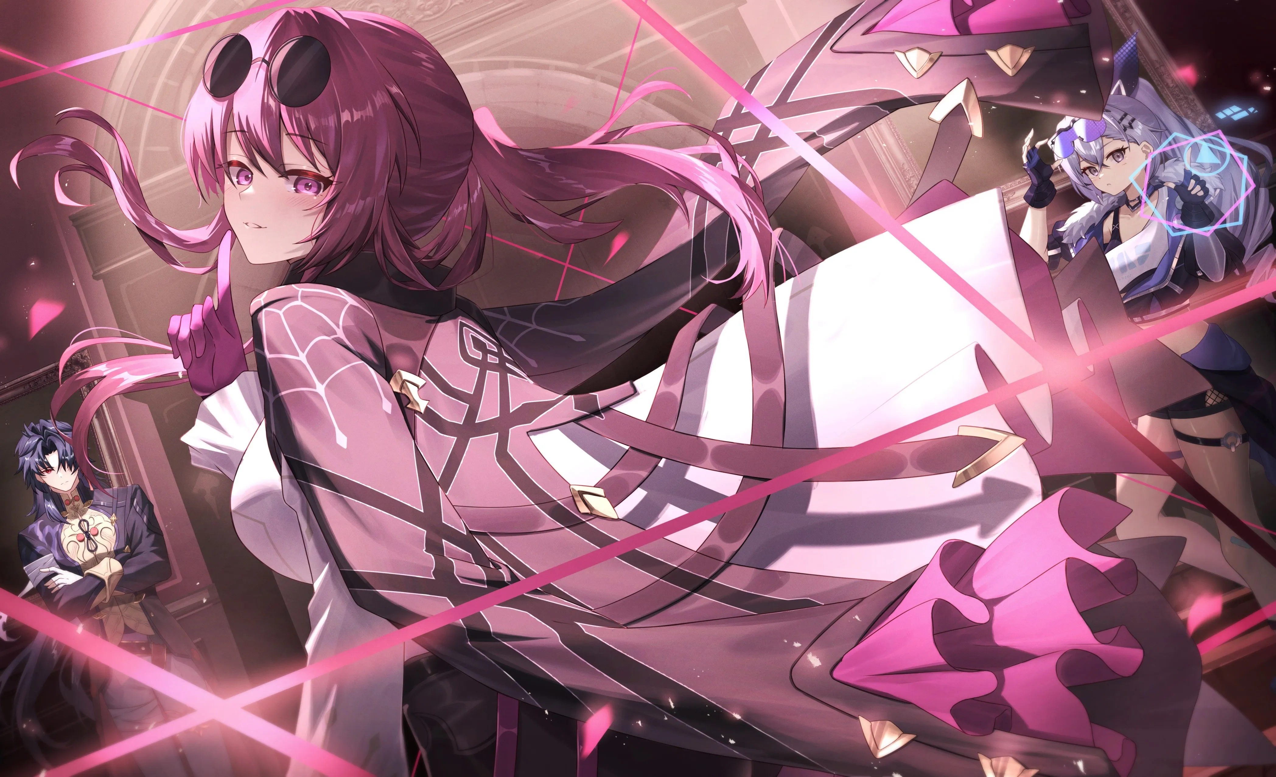 شعر طويل، مسار نجمي، ابتسامة، ذراعان متقاطعتان، وقوف، أنمي، فتاة، قفاز، خجول  4K Wallpapers